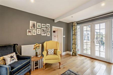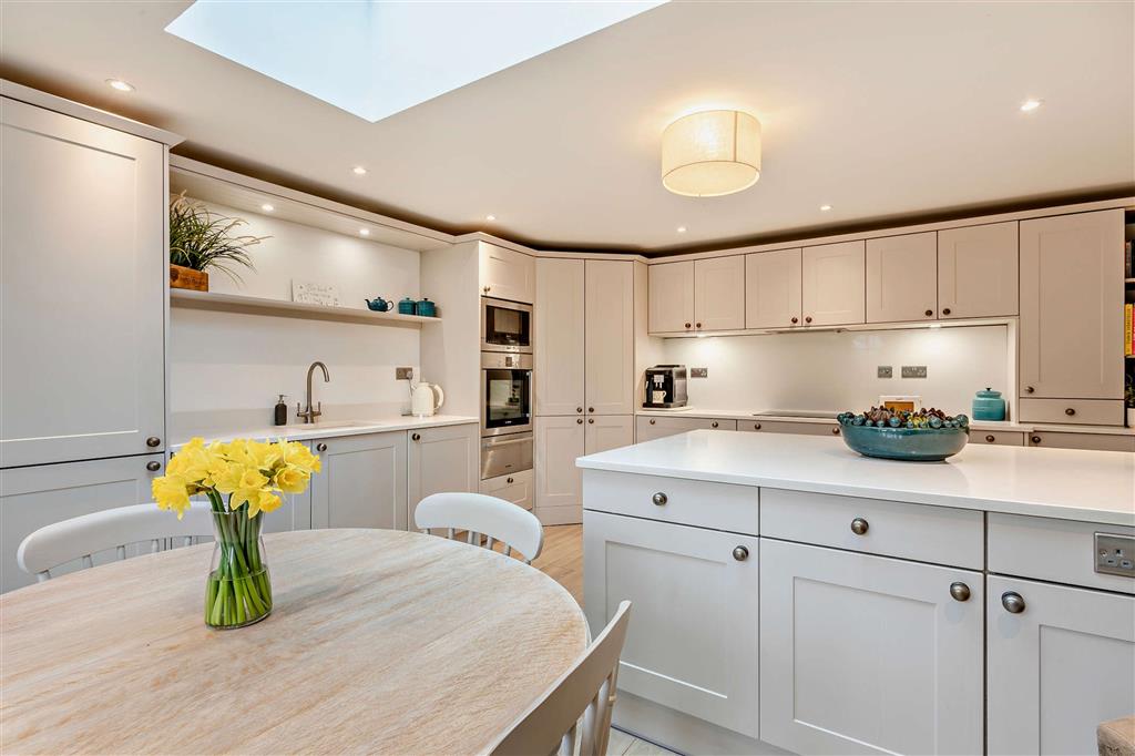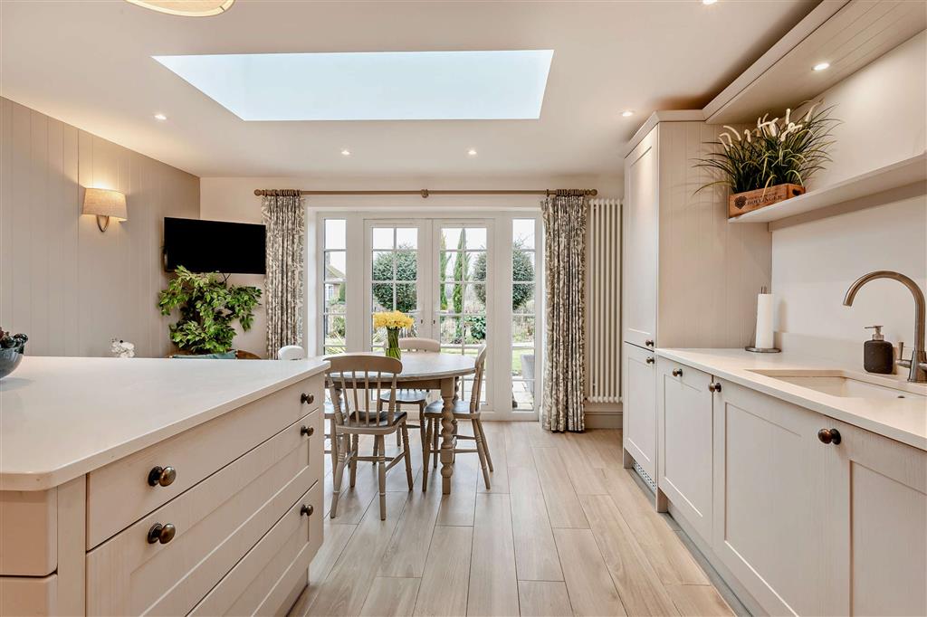 At the heart of the home is the impressive kitchen/breakfast room - with large french doors opening onto the patio area and roof lantern. A recent extension to the original property, it has been designed in keeping with the cottage aesthetic with shaker-style units and quartz worktops, and panelled wall. It includes a large walk-in corner larder unit, large peninsular providing both an area for preparation as well as socialising, a number of deep pan drawer units, plus a range of integrated appliances - extractor fan over induction hob, built-in single oven, combination microwave oven, warming drawer, dishwasher, fridge freezer and wine fridge. A large open area provides space for both informal seating and kitchen table and chairs.