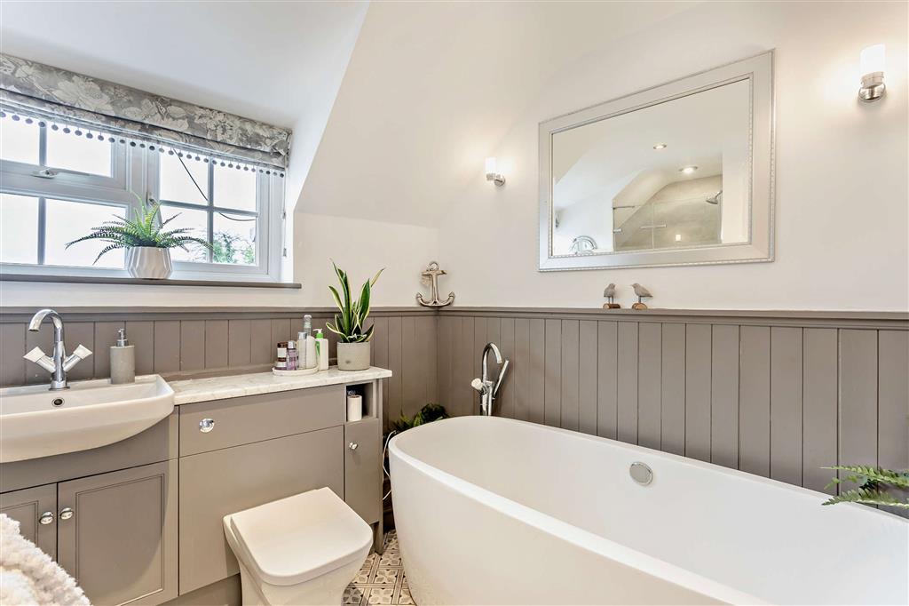 The beautifully appointed bathroom enjoys river views and features a freestanding bath, walk-in double shower with wall niches, fitted vanity unit and back-to-wall WC with integrated storage. Half-wall tongue and groove panelling adds character, and a traditional heated towel rail completes the room.