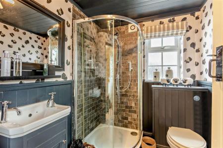 The ground floor shower room is stylishly appointed with half-wall panelling, a semi-circular shower cubicle, vanity unit with hand basin, traditional-style heated towel rail and side aspect window.