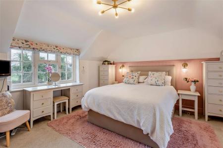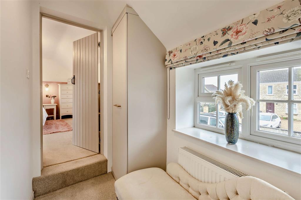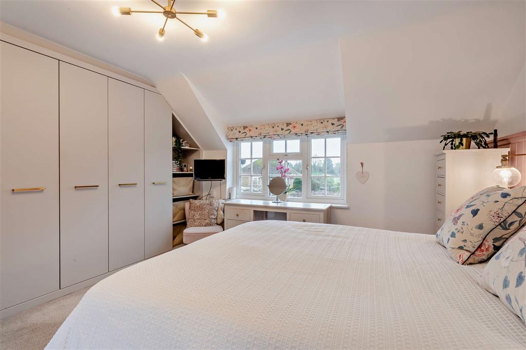 The first floor benefits from an expansive split-level landing arranged across two areas. One provides a built-in linen cupboard and under-eave bookcases and space for additional furniture, while the other serves as a walk-through dressing area with fitted wardrobes to the principal bedroom.