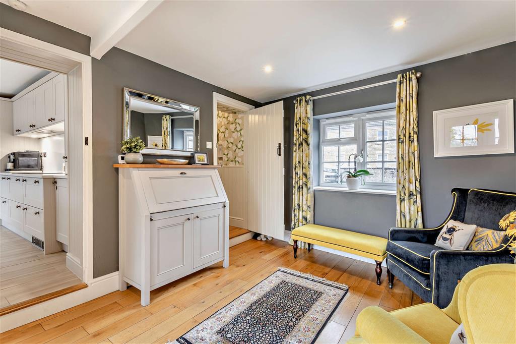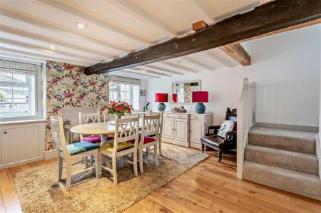 The separate dining room provides a wonderful entertaining space, complete with exposed beams, wooden flooring, original fireplace recess, now closed and styled as a decorative alcove, and bespoke cupboards set below the two front windows. Perfect for hosting large family gatherings and dinner parties. The staircase leads to the first floor.