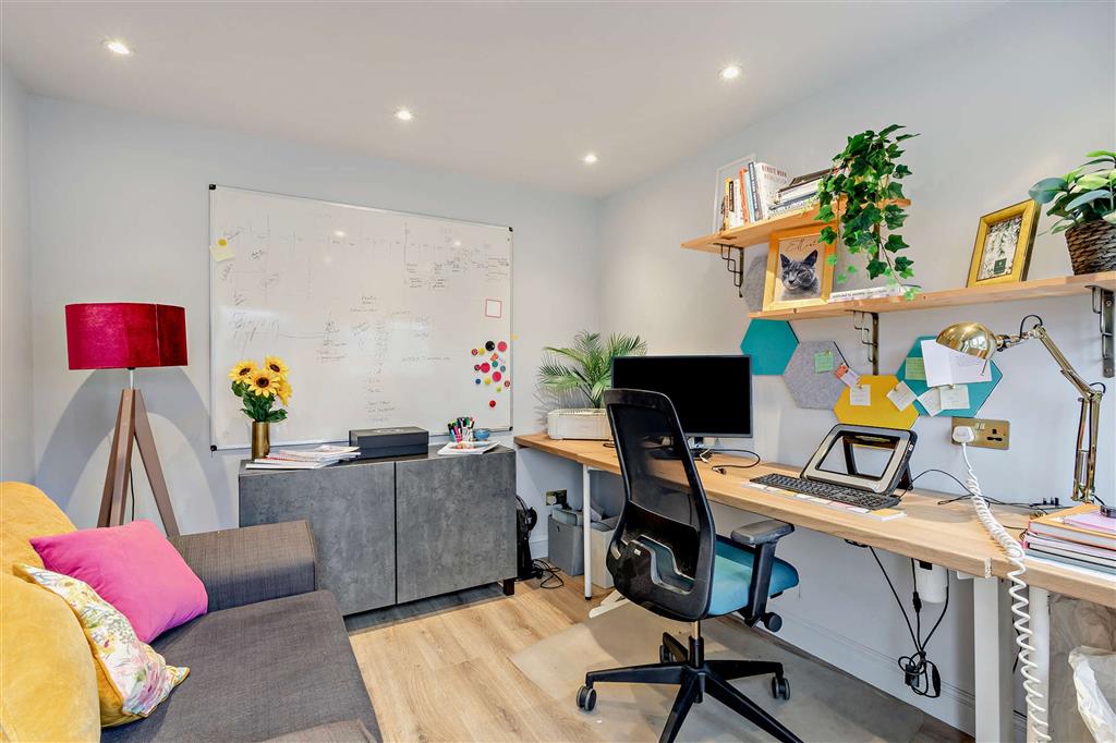 Externally, the property continues to impress. A partially converted garage provides a superb studio/office space, plaster boarded with spotlighting, a garden-facing window and side access door - ideal for those working from home, running a small business, or seeking a creative retreat. The remaining garage space provides good storage space and benefits from an electric up-and-over door, power and lighting. The cobbled double driveway provides off-road parking for two vehicles.