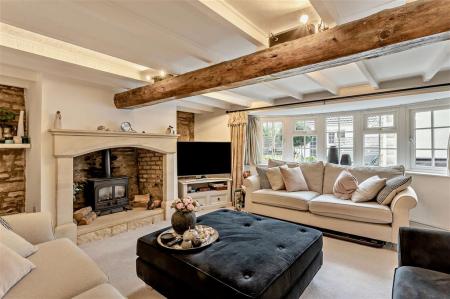 The lounge is a tranquil, cosy retreat, with a large bow window framing views across the landscaped gardens towards the river. Exposed beams enhance the character, while stone-walled alcoves sit either side of the deep inglenook-style fireplace. A cast iron gas-fired wood burner forms a striking focal point, creating a warm and inviting atmosphere. A small understairs cupboard provides additional storage.