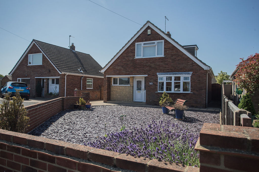 OUTSIDE FRONT: Area laid to gravel with various shrubs. Driveway to side of property offering off road parking leading to garage.