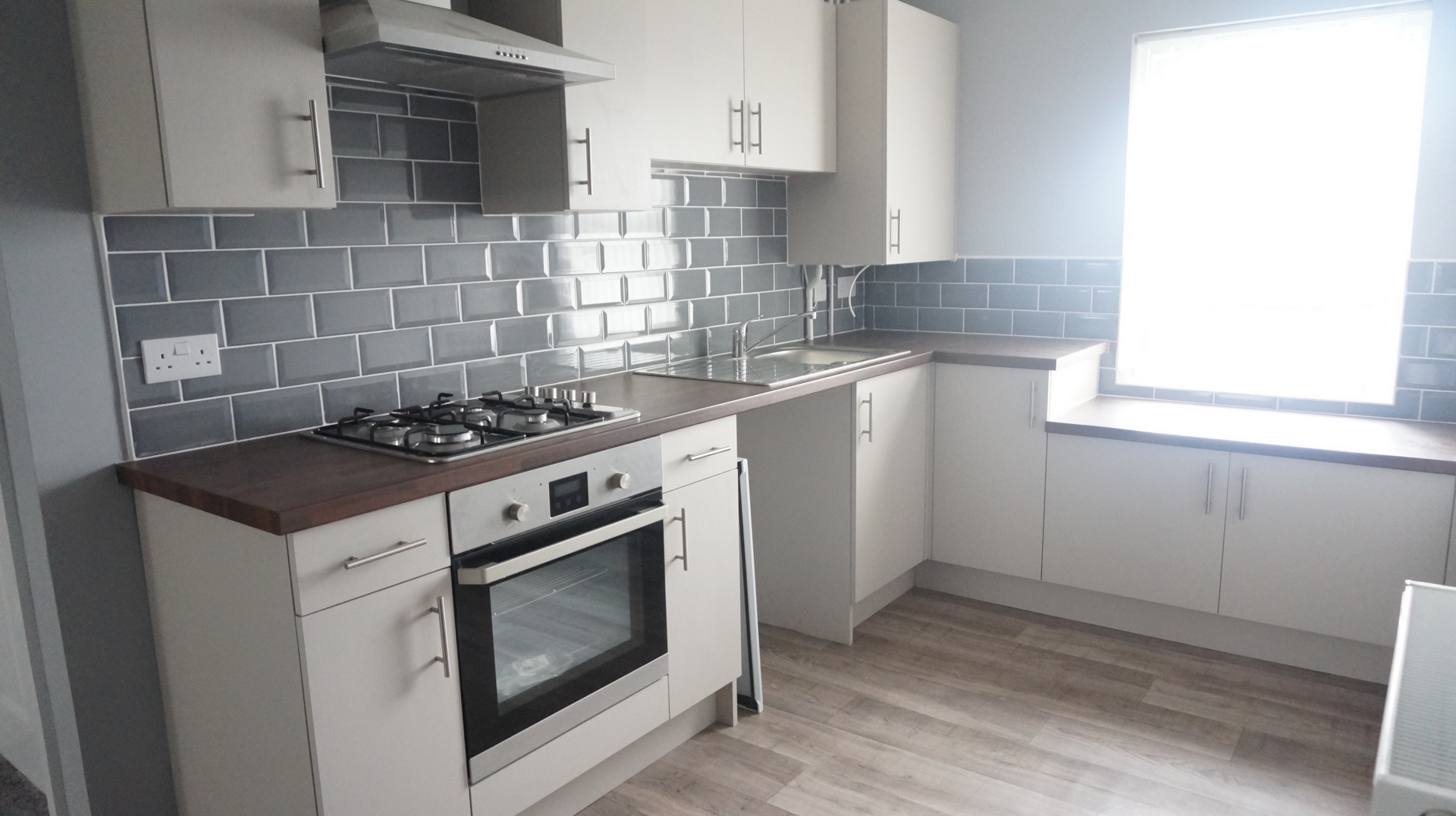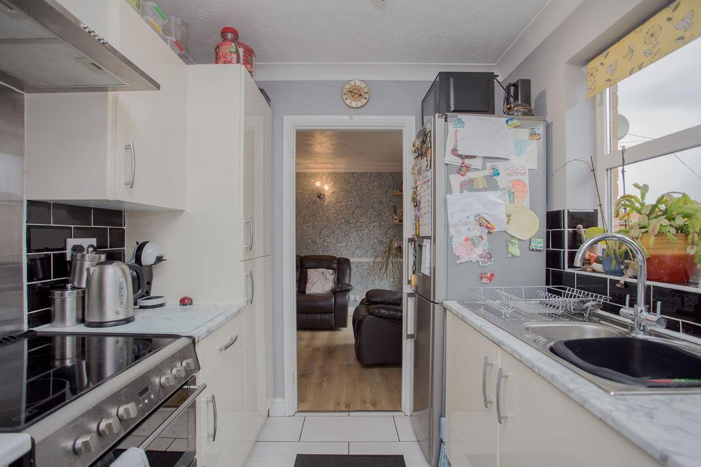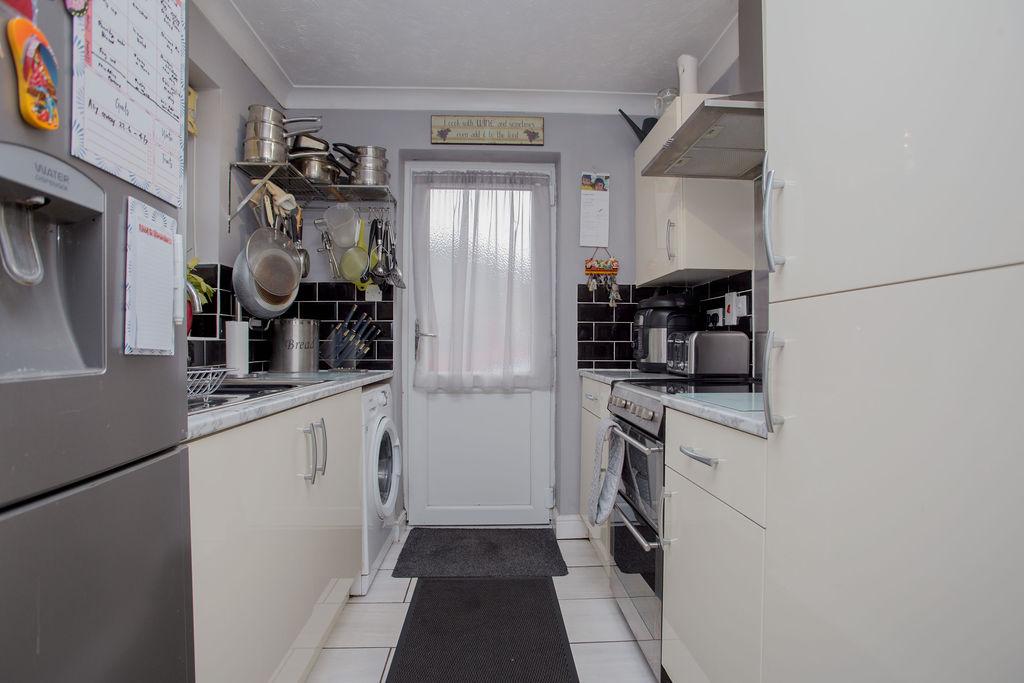 KITCHEN: 8'1" x 7'1" (2.46m x 2.16m), Range of base and eye level units with worksurface over. Tiled splashbacks. Stainless steel sink with drainer and mixer tap over. Space for fridge freezer. Space for washing machine. Cooker with splashback and extractor hood over. Door leading to side of property. uPVC double glazed window to rear elevation.