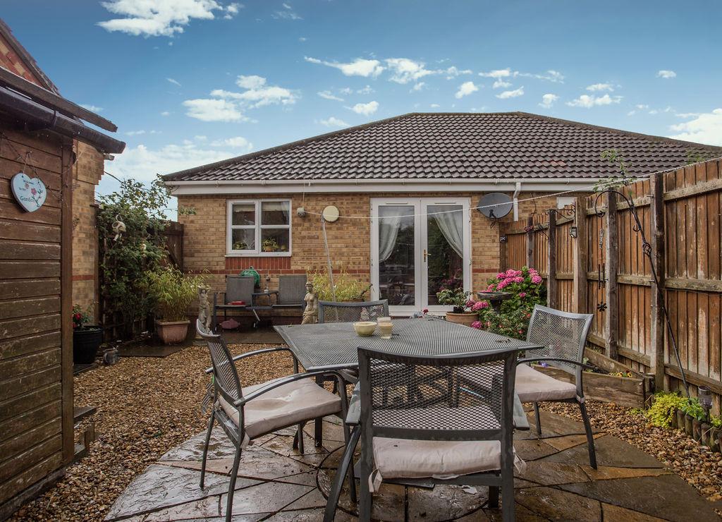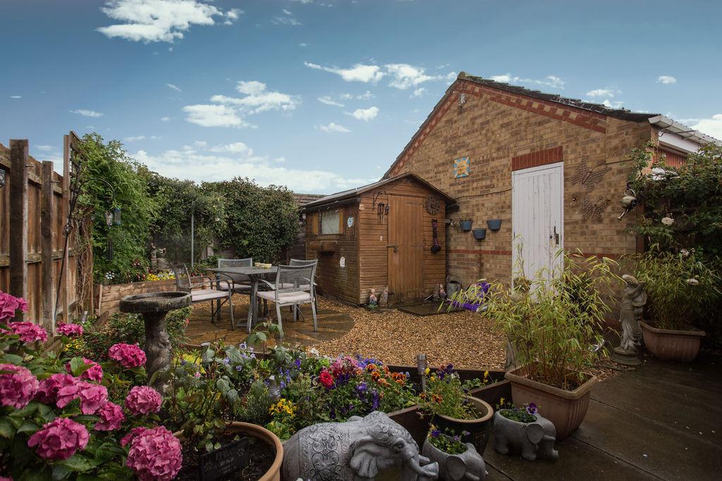 REAR GARDEN: Mainly laid to gravel with patio area and planted borders. Garage with personal door to side. Fenced boundaries. Garden shed.