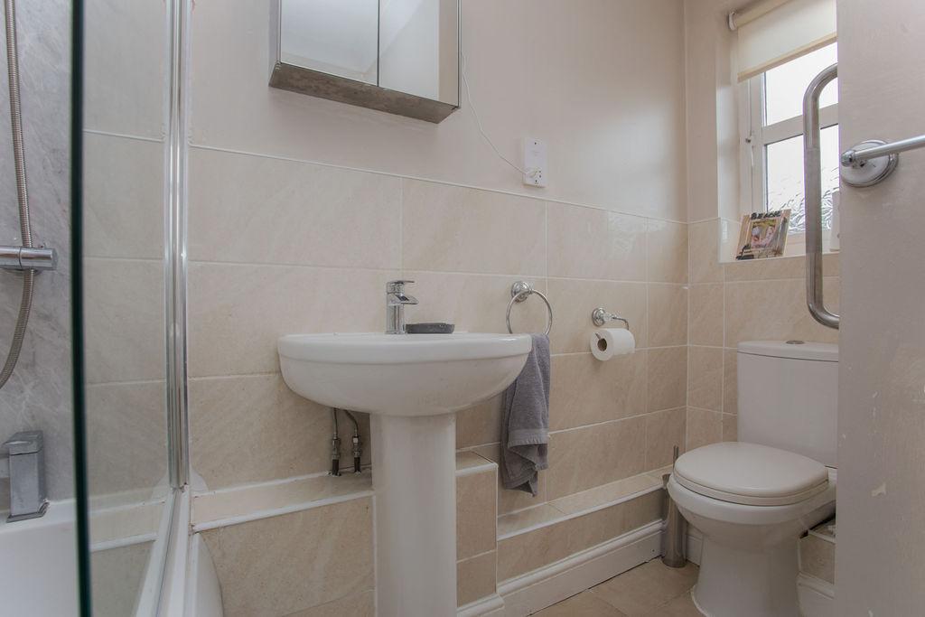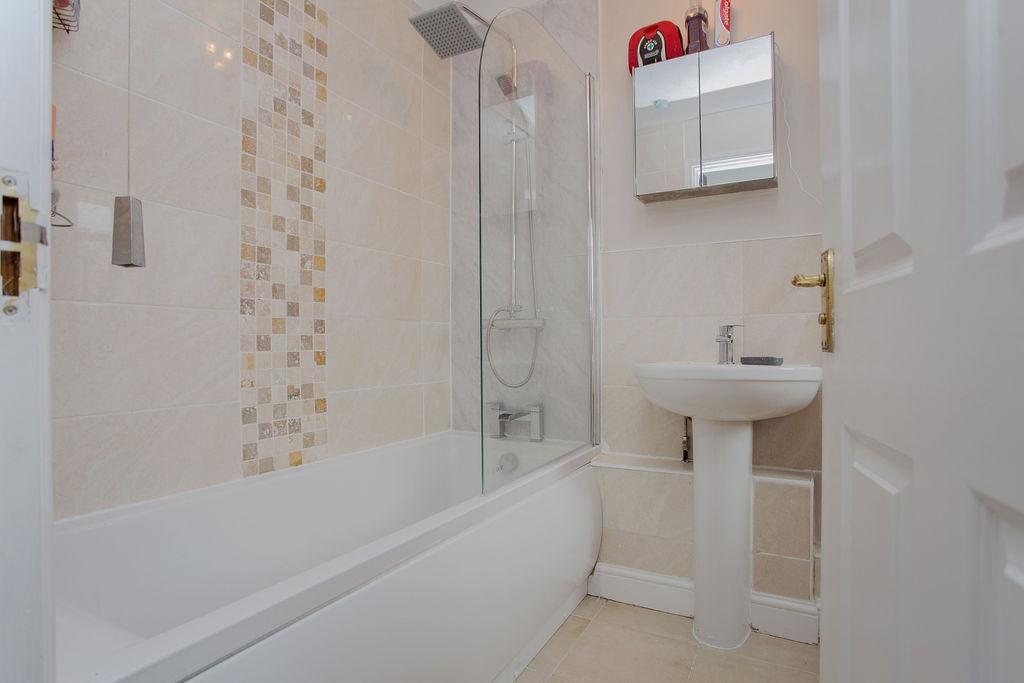 BATHROOM: uPVC double glazed window to side elevation. Ceramic tiled walls to half height. Three piece suite comprising of a low level W.C, wash hand pedestal and bath with shower fitment and waterfall shower over and privacy screen. Tiled flooring. Towel rail.