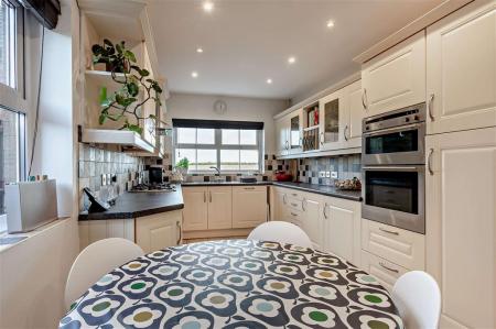 A feature galleried landing leads to four generously sized double bedrooms, including a principal suite with a contemporary en-suite bathroom. A further family bathroom serves the remaining bedrooms. From the rear elevations, the home enjoys stunning, far-reaching views over open countryside, creating a sense of calm and space rarely found so close to excellent transport links.