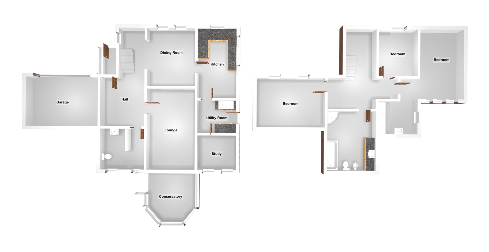 - Ground floor: porch, hallway, living room to conservatory, dining room, kitchen, utility, study, and WC