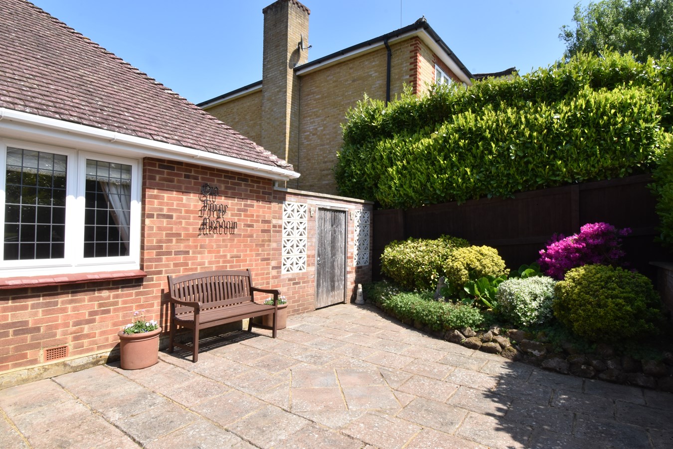 Laurel hedge to front. Raised area of lawn. Path with steps down to front door and secluded patio area with raised shrub beds.