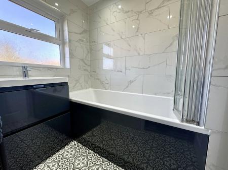 Matching suite comprising panelled bath with mixer tap and rain head shower attachment over, wash hand basin with storage under, fully tiled walls, tiled wall, extractor fan, PVCu double glazed frosted window to rear,.