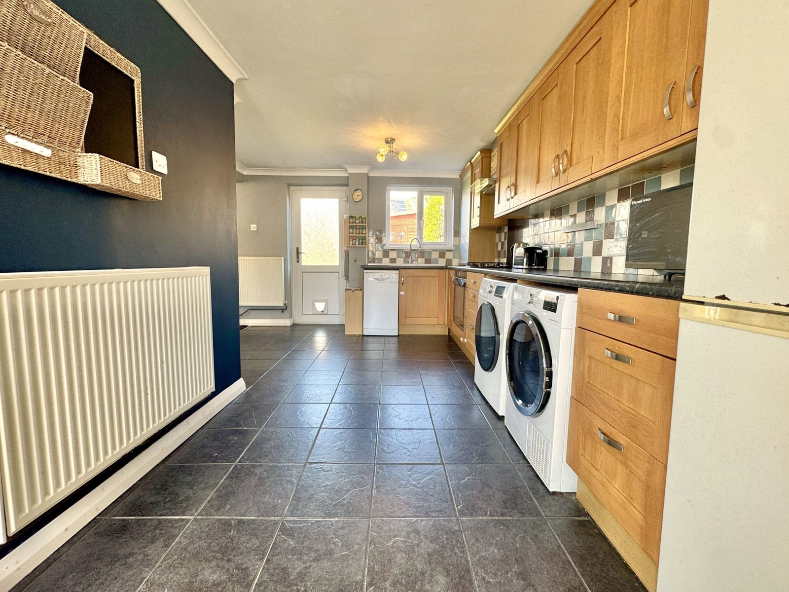 Roll edged worksurfaces with cupboards and drawers under and matching wall units, single drainer one and a half bowl sink drainer unit with mixer tap, built in electric oven and four ring gas hob with extractor hood over, plumbing for washing machine and dishwasher, tiled floor, understairs storage cupboard, PVCu double glazed windows to front and rear, PVCu double glazed door to rear garden