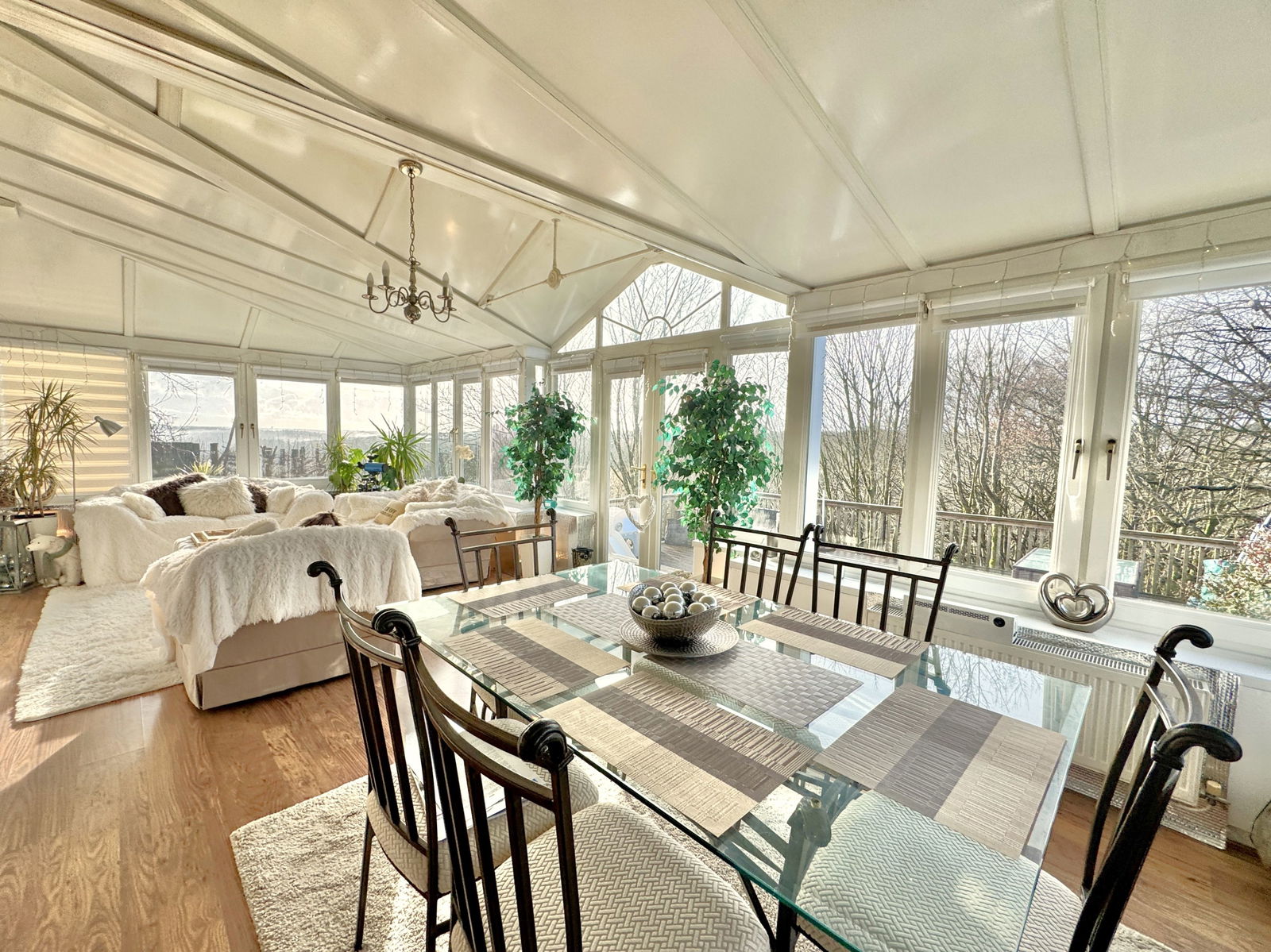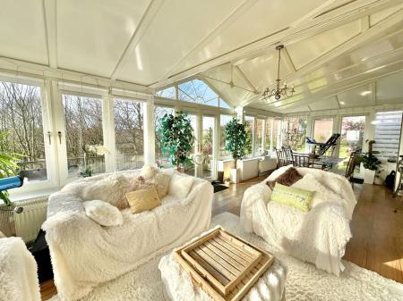 A stunning part of the property, enjoying fantastic views across the surrounding countryside. Two sets of PVCu French doors open onto the rear garden. Wall-mounted electric fire and radiator.