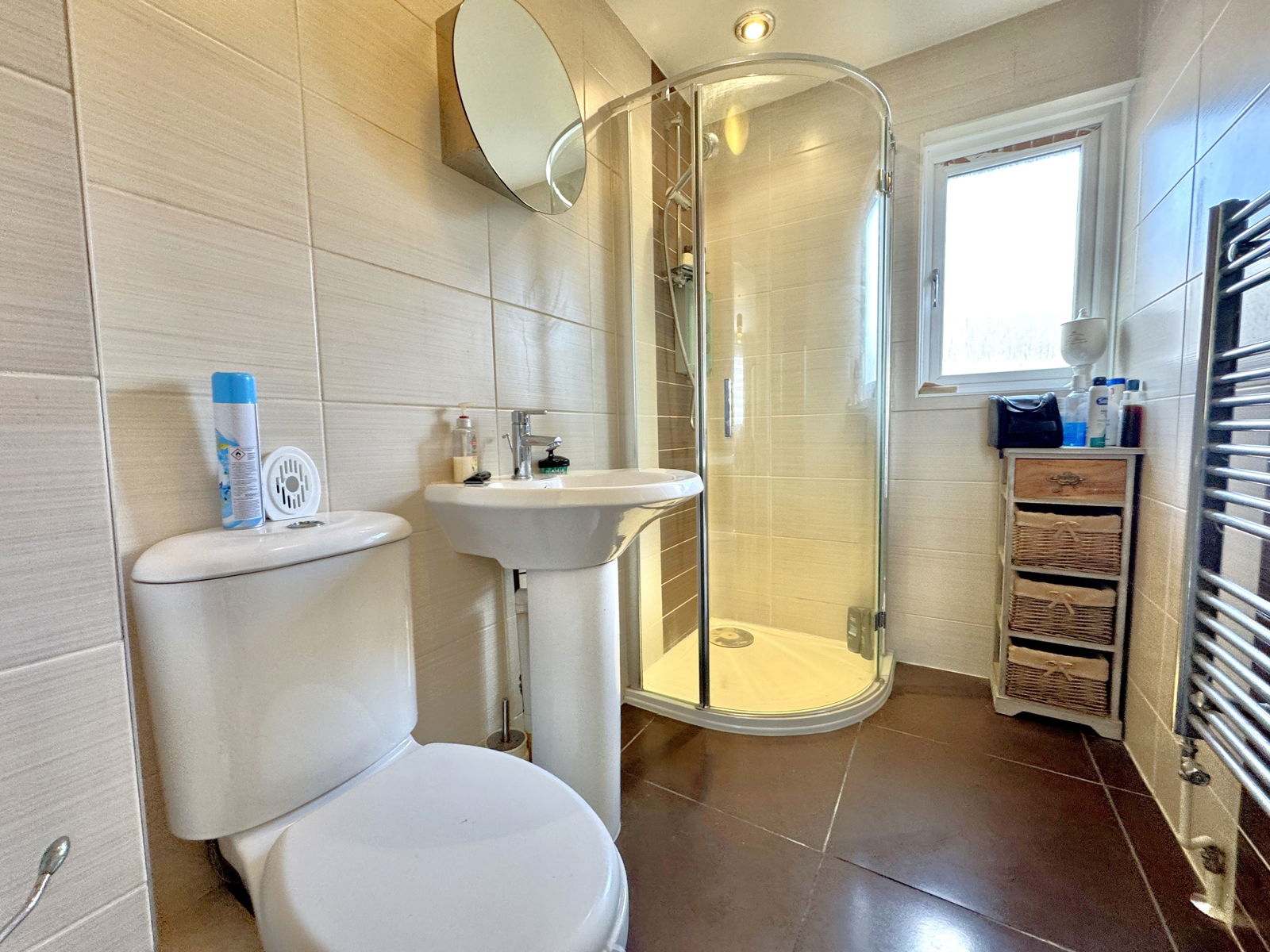 Tiled shower cubicle with inset shower, low-level WC, pedestal wash hand basin, heated towel rail, fully tiled walls, tiled flooring, extractor fan, and PVCu double-glazed window to the rear.