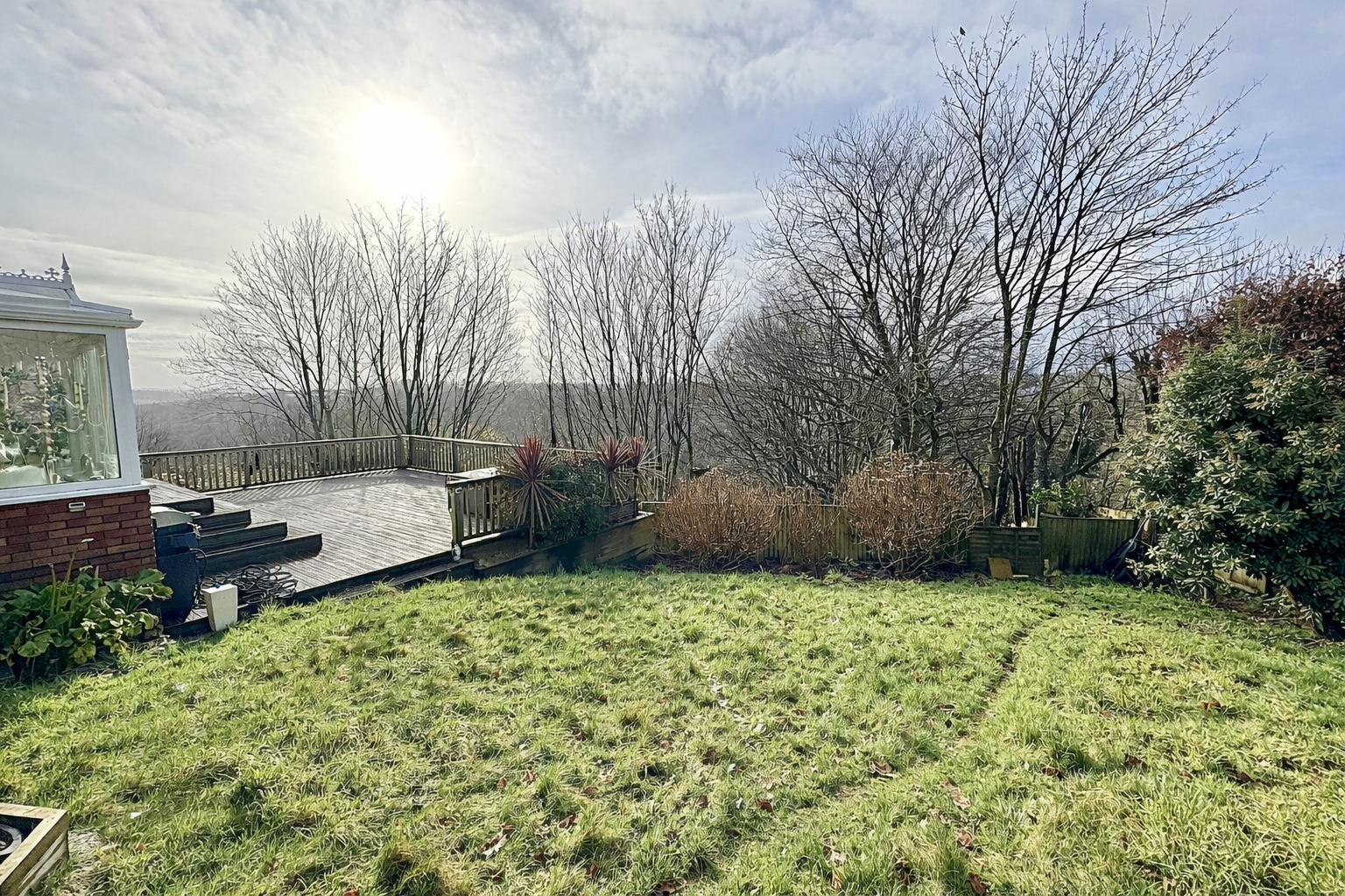 The rear garden is a particular feature of the property. It is south-facing and backs onto Plymbridge Woods. There is a good-sized lawned garden leading to a large enclosed decked sun terrace, enjoying stunning views across the surrounding countryside, which in turn leads to a side garden. The garden is enclosed by fenced boundaries, and a greenhouse to remain.