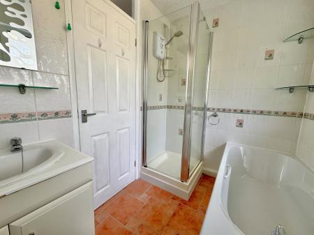 Matching suite comprising panelled bath, low-level WC, wash hand basin with storage under, tiled shower cubicle with inset Triton electric shower, heated towel rail, and PVCu double-glazed window to the rear.
