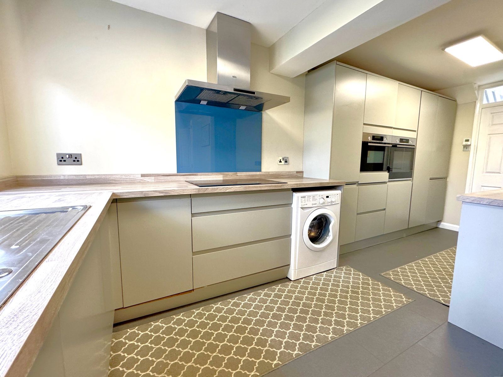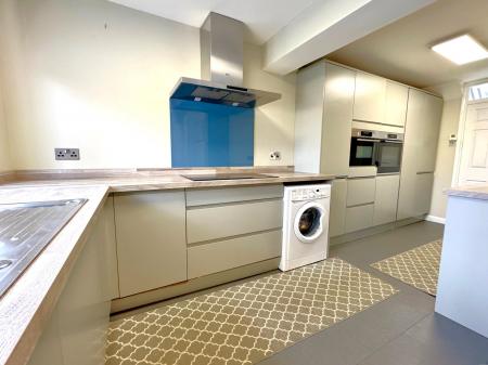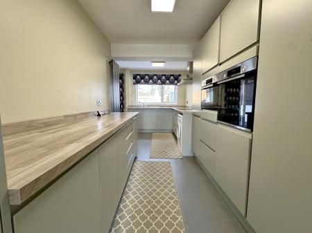 Roll edge worksurfaces with cupboards and drawers under and matching wall units, single drainer one and a half bowl stainless steel sink unit with mixer tap, built-in electric oven and four ring hob with extractor hood over, plumbing for washing machine, built-in fridge/freezer and dishwasher, radiator, PVCu double-glazed window to the rear, and PVCu double-glazed sliding patio doors to the garden.