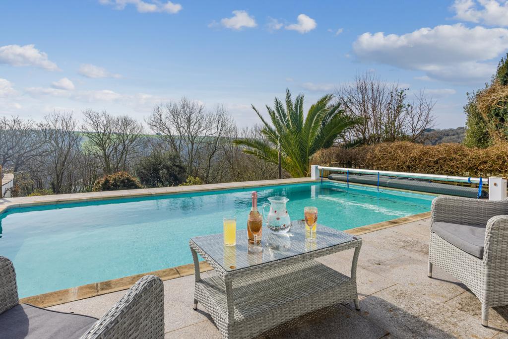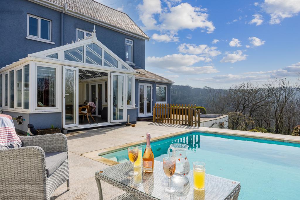 Outside, the property is approached via a broad sweeping private driveway that leads directly to the front door and double garage, with ample parking and the notable advantage, particularly in Newton Ferrers, of being able to arrive and walk straight into the house on the level. The gardens are arranged across a series of distinct areas, with landscaped planting and generous stone terraces close to the house giving way to wider lawns and more natural sections beyond. Just as important is the sunny aspect, with the house facing south and the pool terrace enjoying a south-westerly orientation, bringing sun for much of the day and into the evening. Immediately adjoining the house, the heated swimming pool and its surrounding terrace create a wonderful setting for summer living, while, unusually for Newton Ferrers, a