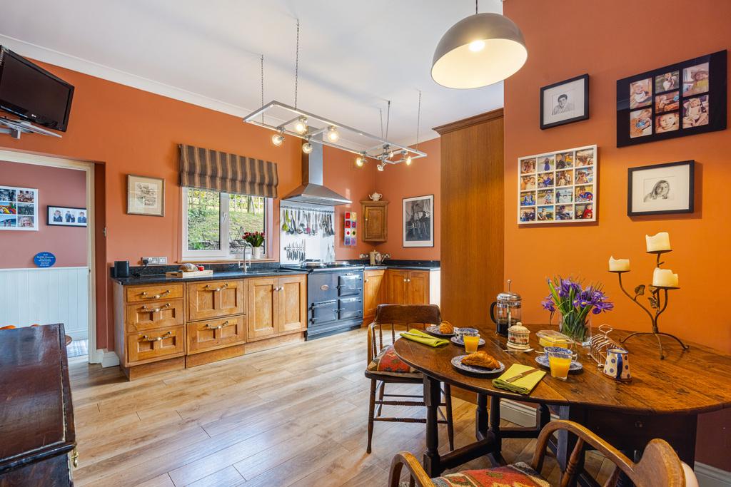Set just beyond the main reception spaces, the kitchen/breakfast room has an easy, welcoming character, with morning sun streaming in and lending the room a bright and uplifting feel. Centred around the AGA, the kitchen was crafted by renowned local cabinet maker Yealm Kitchens, with bespoke cabinetry, dark stone worktops, and space for informal dining coming together in a setting that is as well-suited to cooking as it is to relaxed breakfasts and lunches. A separate pantry and adjoining utility room provide excellent practical support, while close by, the ground-floor shower room and door opening directly onto the pool terrace make summer use of the garden and swimming pool particularly convenient.