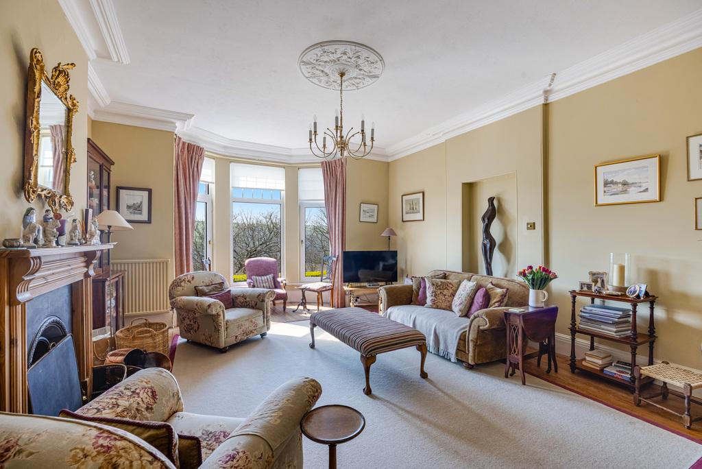The drawing room is set within the bay-windowed front elevation, one of the house’s most distinctive architectural features. It enjoys an attractive outlook across the garden and towards the estuary, with the bay window drawing in excellent natural light and lending the room both depth and elegance. Period details, including the fireplace, cornicing and ceiling rose, further enhance its character, creating a