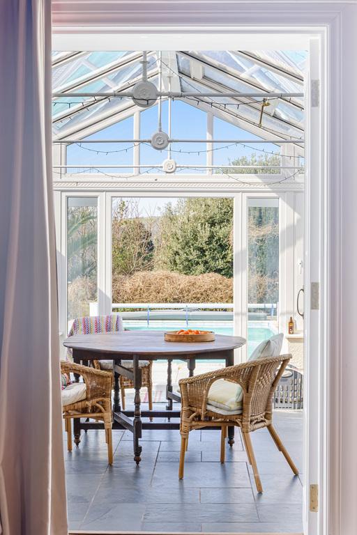 The conservatory is a beautifully light-filled space, overlooking the terrace and swimming pool and strengthening the connection between the house and garden. With glazed walls and a vaulted glass roof, it offers an inviting setting for informal dining, relaxed sitting or morning coffee, while doors opening directly onto the terrace make it particularly appealing in the warmer months, when it becomes a natural