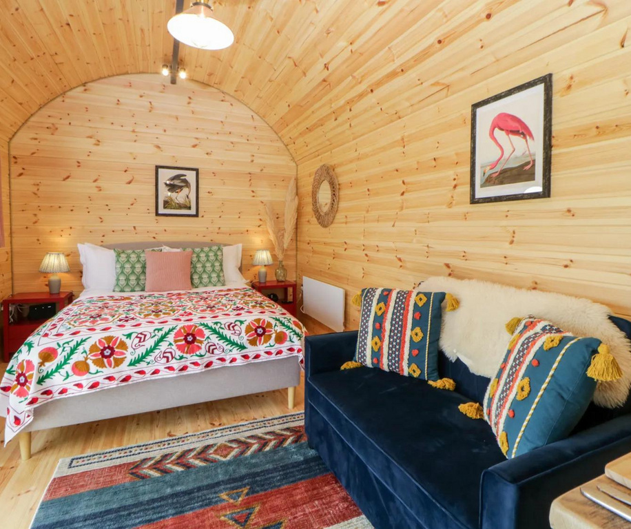 Firefly Cabin is arranged for four, with a king bed and twin beds, and an additional sofa-bed allowing flexibility for a fifth guest. Set within a peaceful valley position, it has a contemporary feel with two mezzanine bedrooms, alongside a well-equipped kitchenette and en-suite shower room. Outside, guests have a wood-fired hot tub, fire pit, BBQ and seating area.