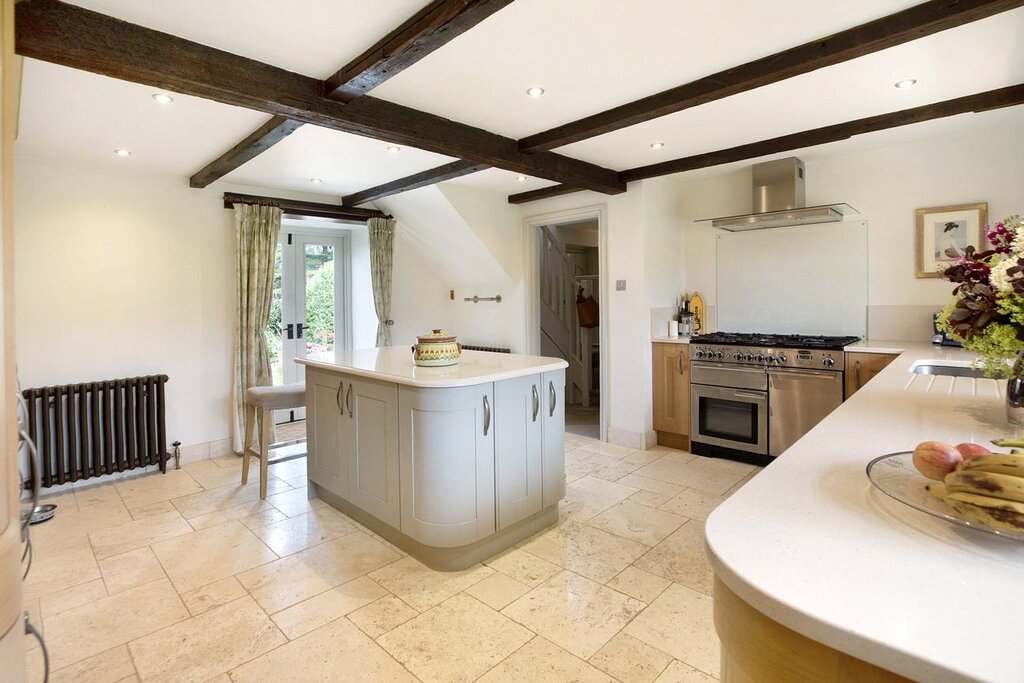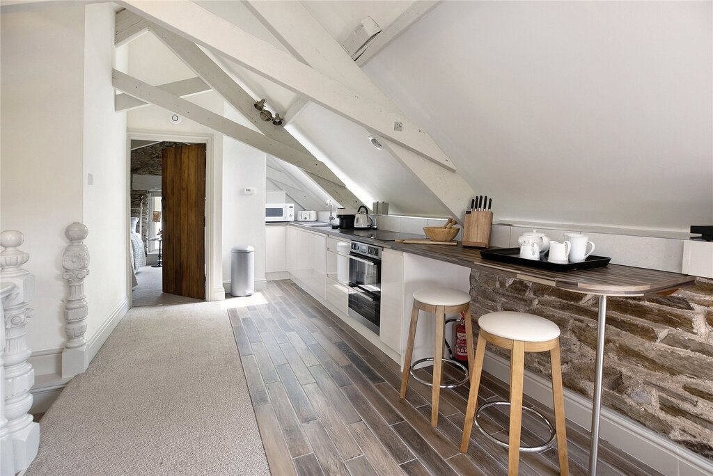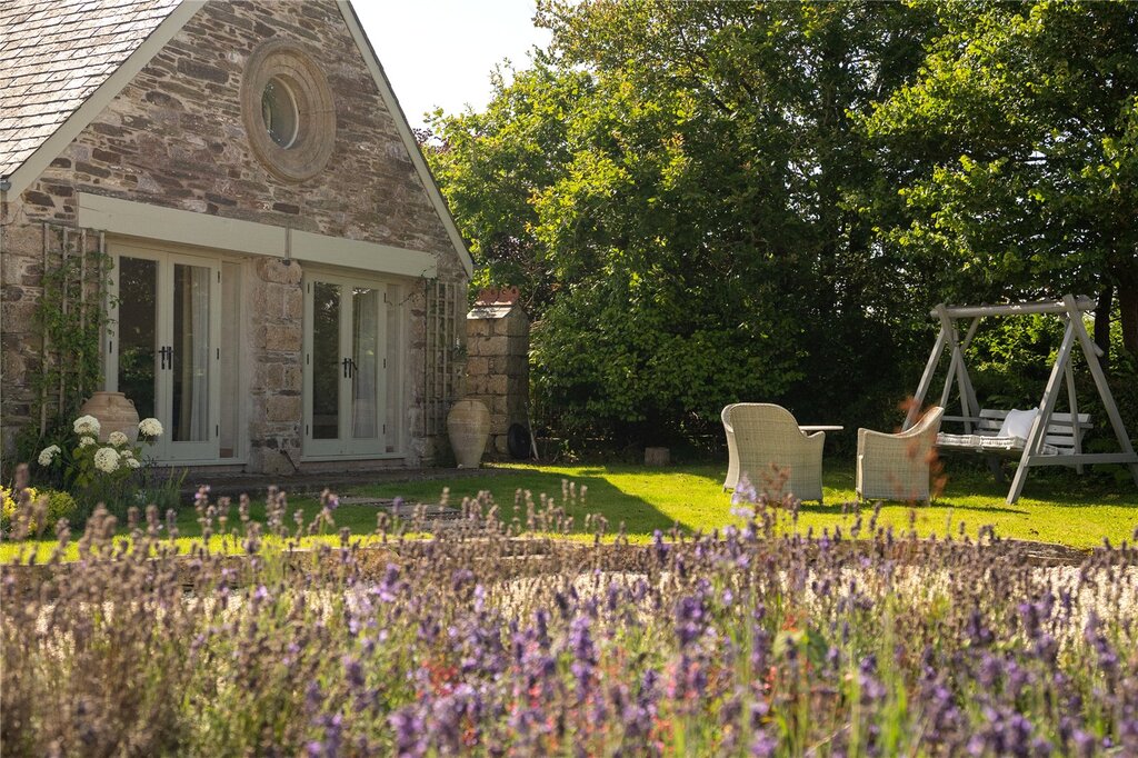 Original architectural fittings have been incorporated where possible including areas of exposed stone, beams, and ceiling timbers plus exposed roof timbers. The main house also now boasts a first floor balcony with fantastic, sweeping views, a veranda, several glazed doors that allow the house to be opened to the garden and fireplaces in the drawing and sitting rooms. The kitchen/breakfast room is positioned centrally forming a family-centric hub and is fully fitted incorporating a gas range cooker, a large central island, quartz work surfaces and a stone-tiled floor. The first floor offers three bedrooms and a large walk-through playroom/TV room, which could also be used as an occasional bedroom. The main bedroom is a gorgeous haven of tranquillity, with double doors leading to a balcony with superb far-reaching views, a beautiful en suite bathroom and full length dressing room, fitted with wall-to-wall shelving and hanging. There is also a family shower room.