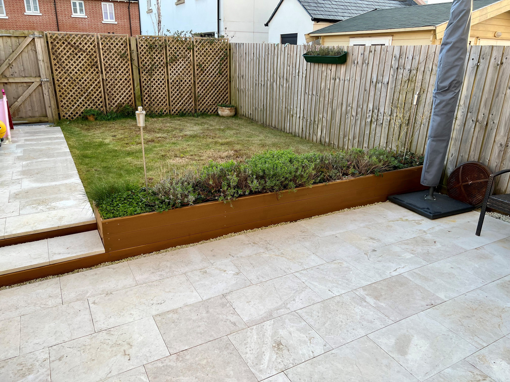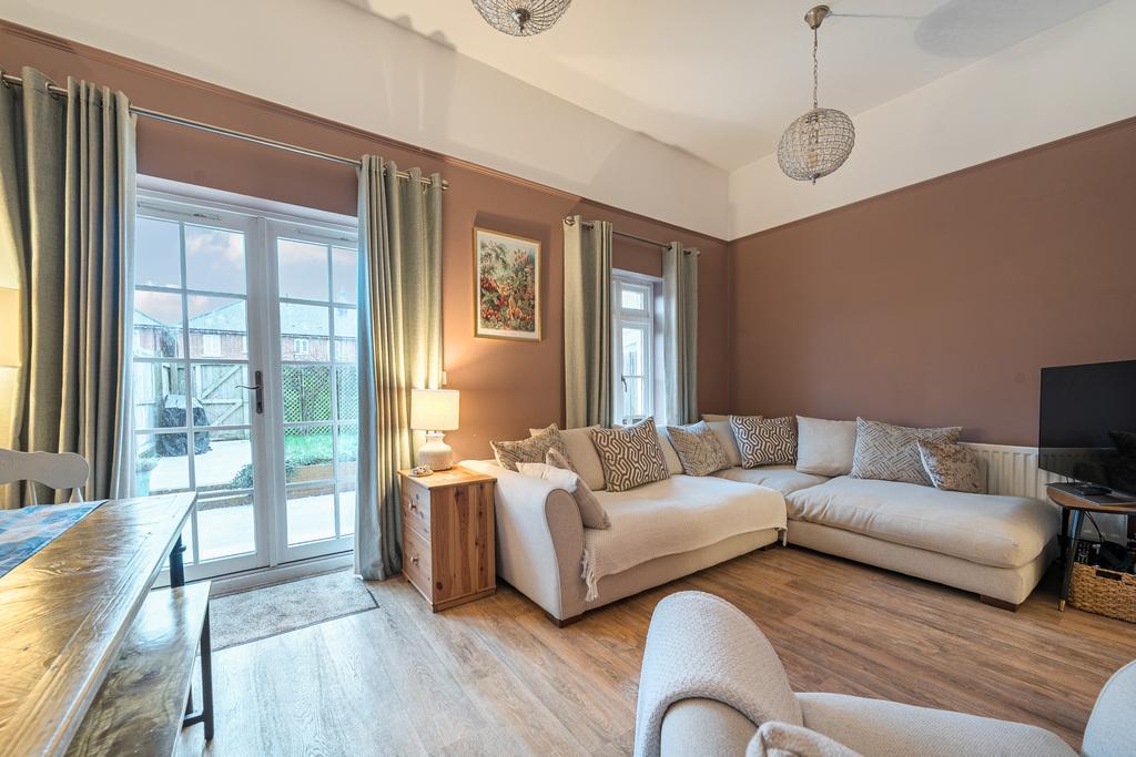 - South-facing landscaped garden with terrace and lawn; off-road parking and garage