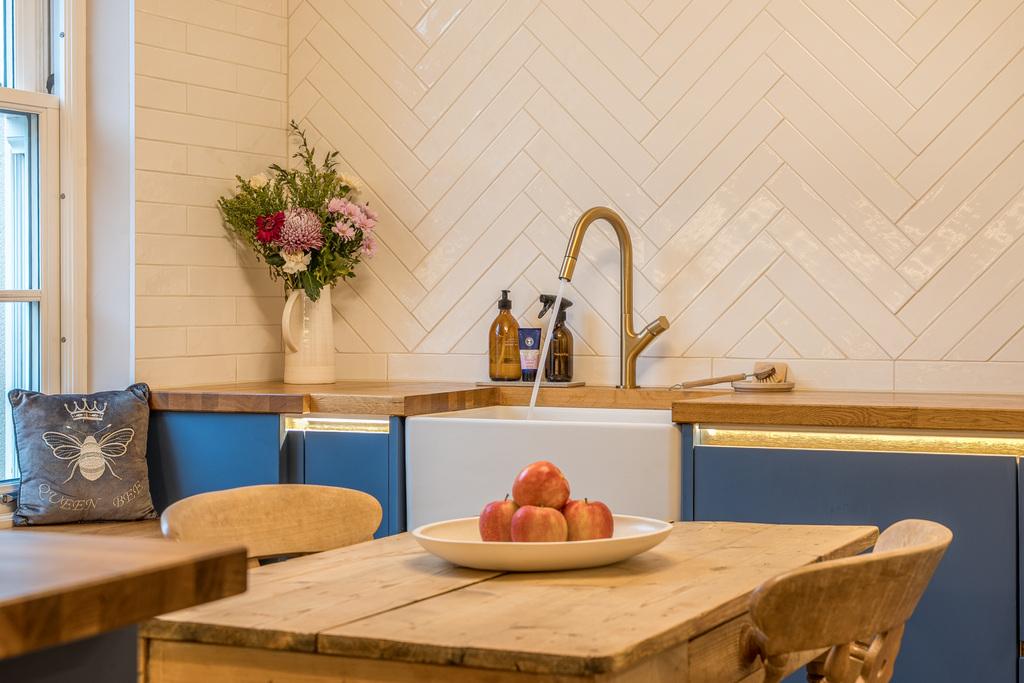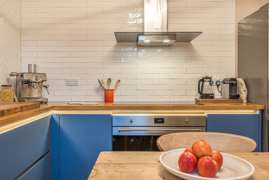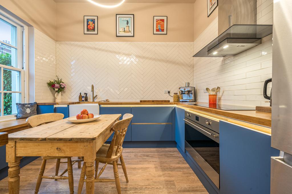 - Central kitchen with modern cabinetry, timber worktops and herringbone tiling