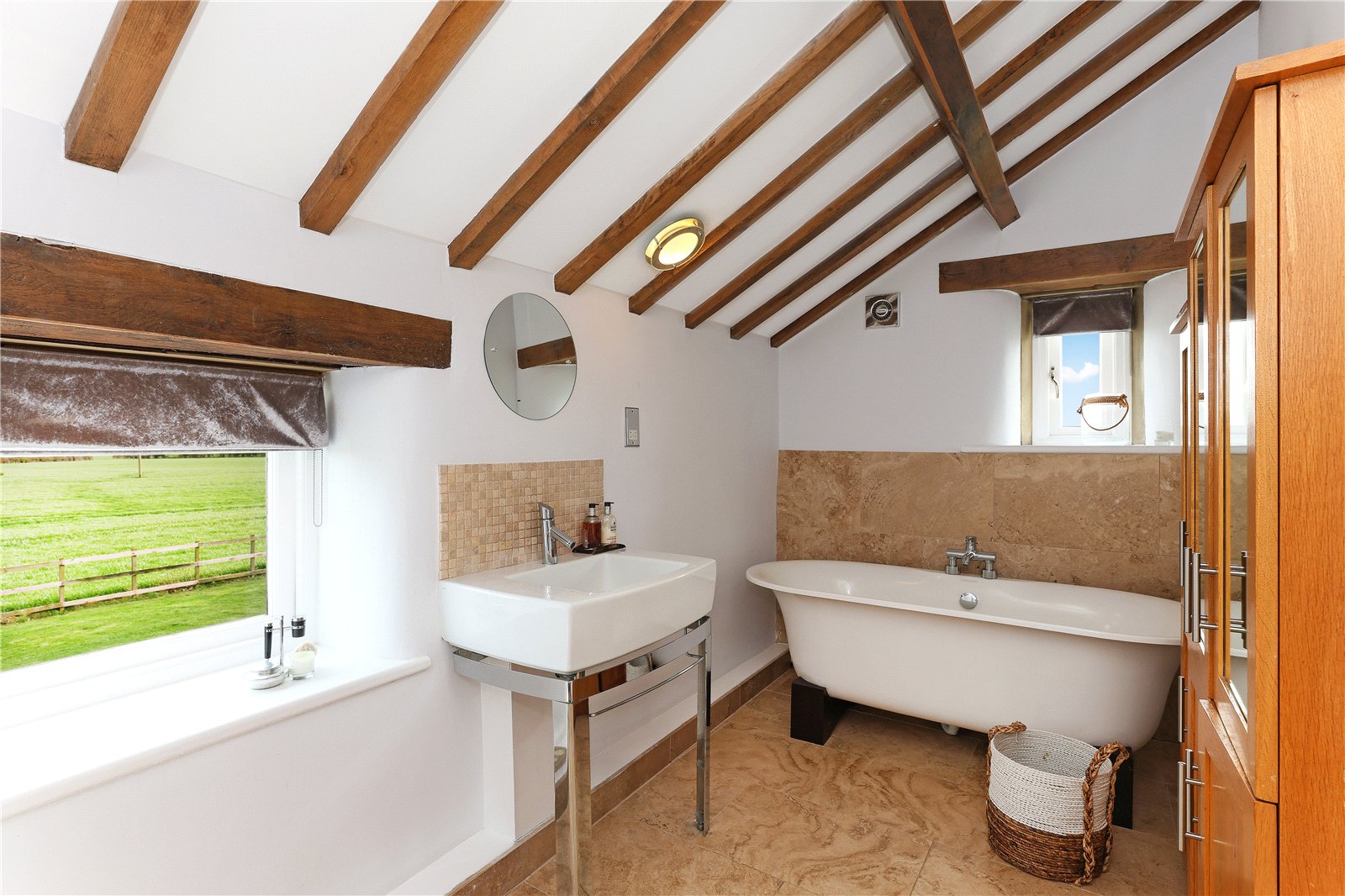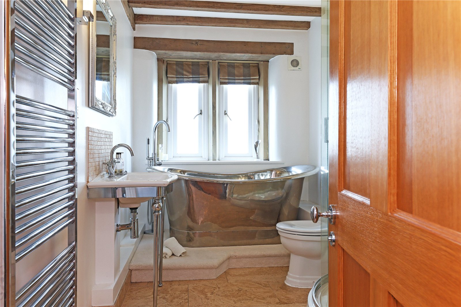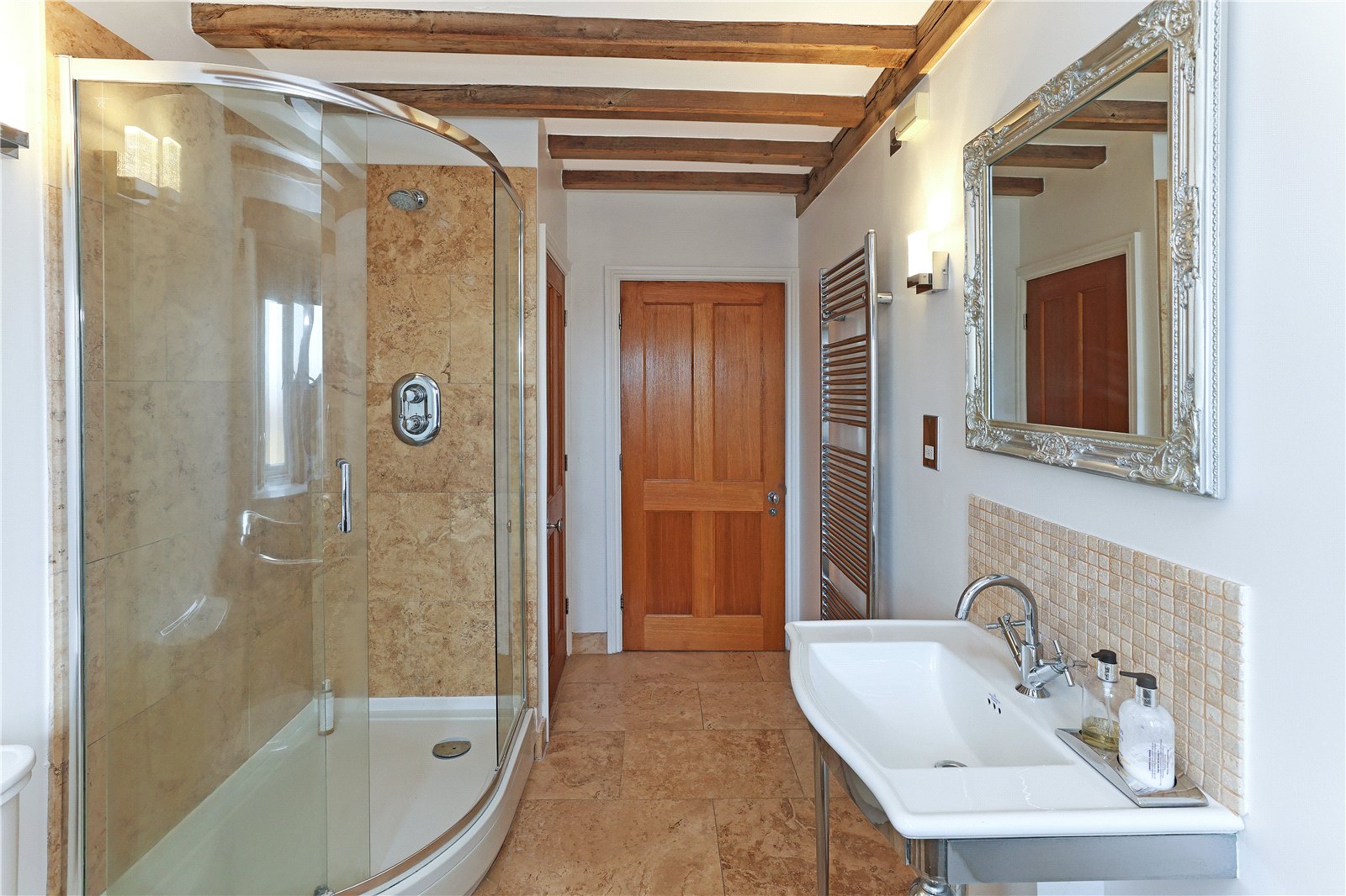 House Bathroom Furnished with feature free standing polished chrome bath, walk-in shower with feature glass screen, Raindance shower head, wash hand basin, low flush w/c, exposed beam work and natural stone flooring.
