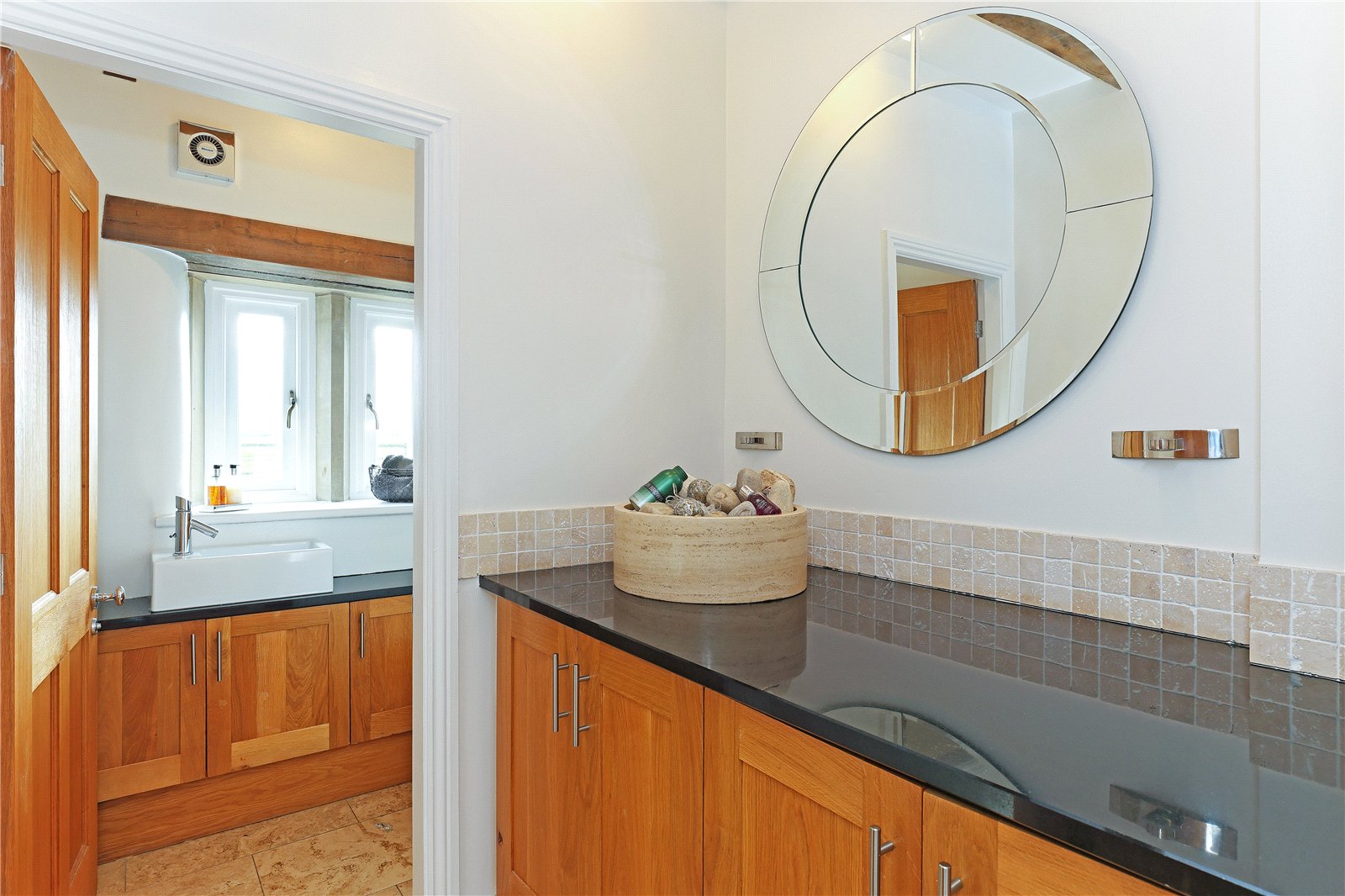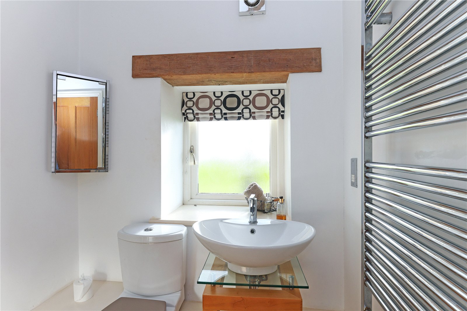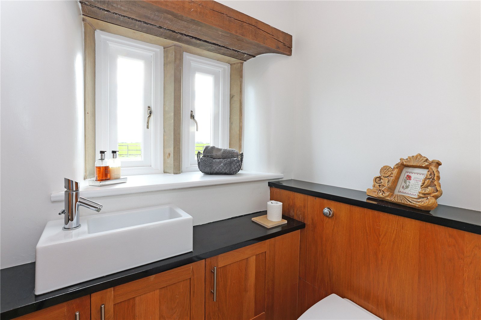 Cloakroom Having low flush w/c, wash hand basin set in vanity unit, exposed beams, feature window.