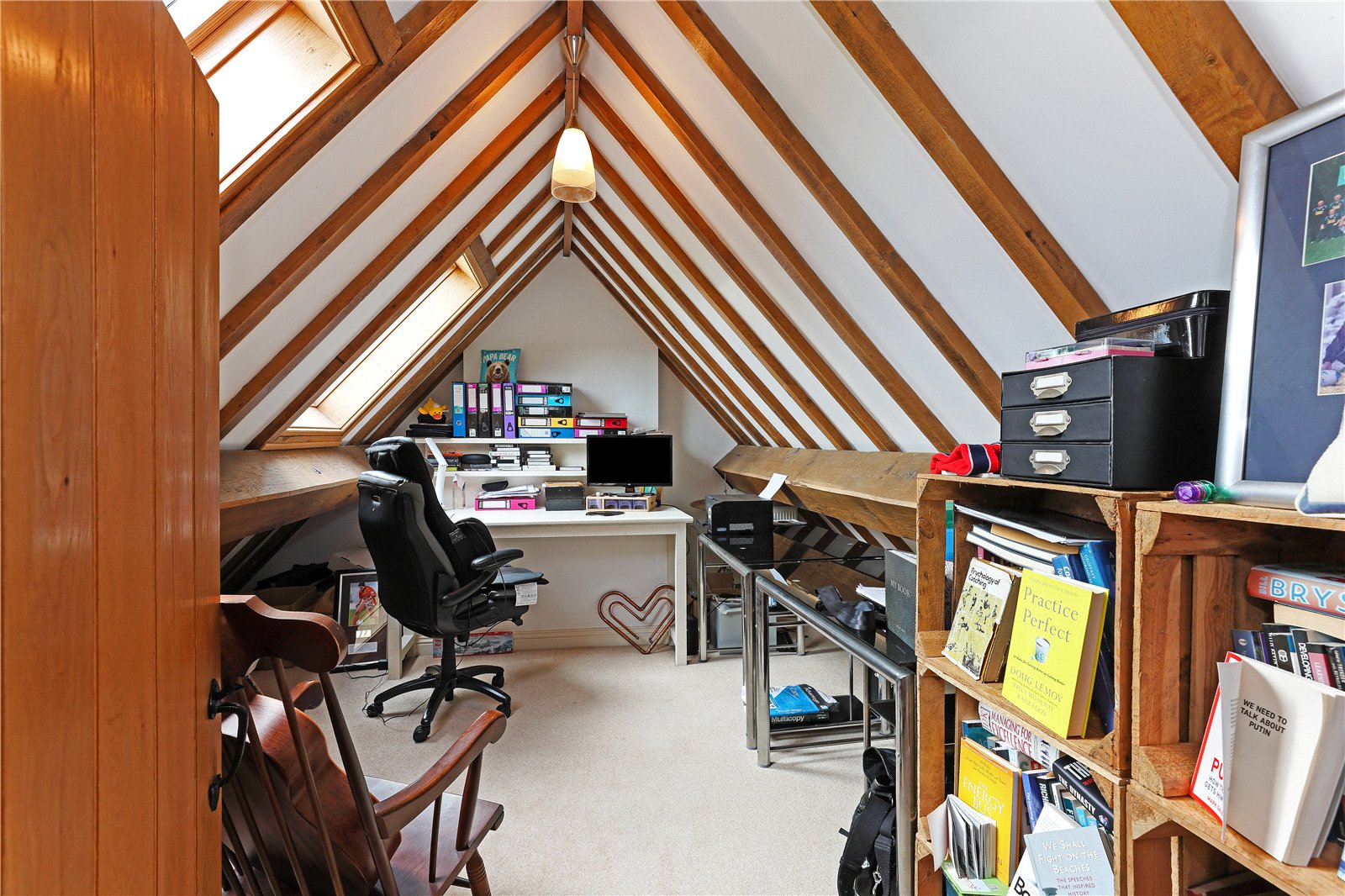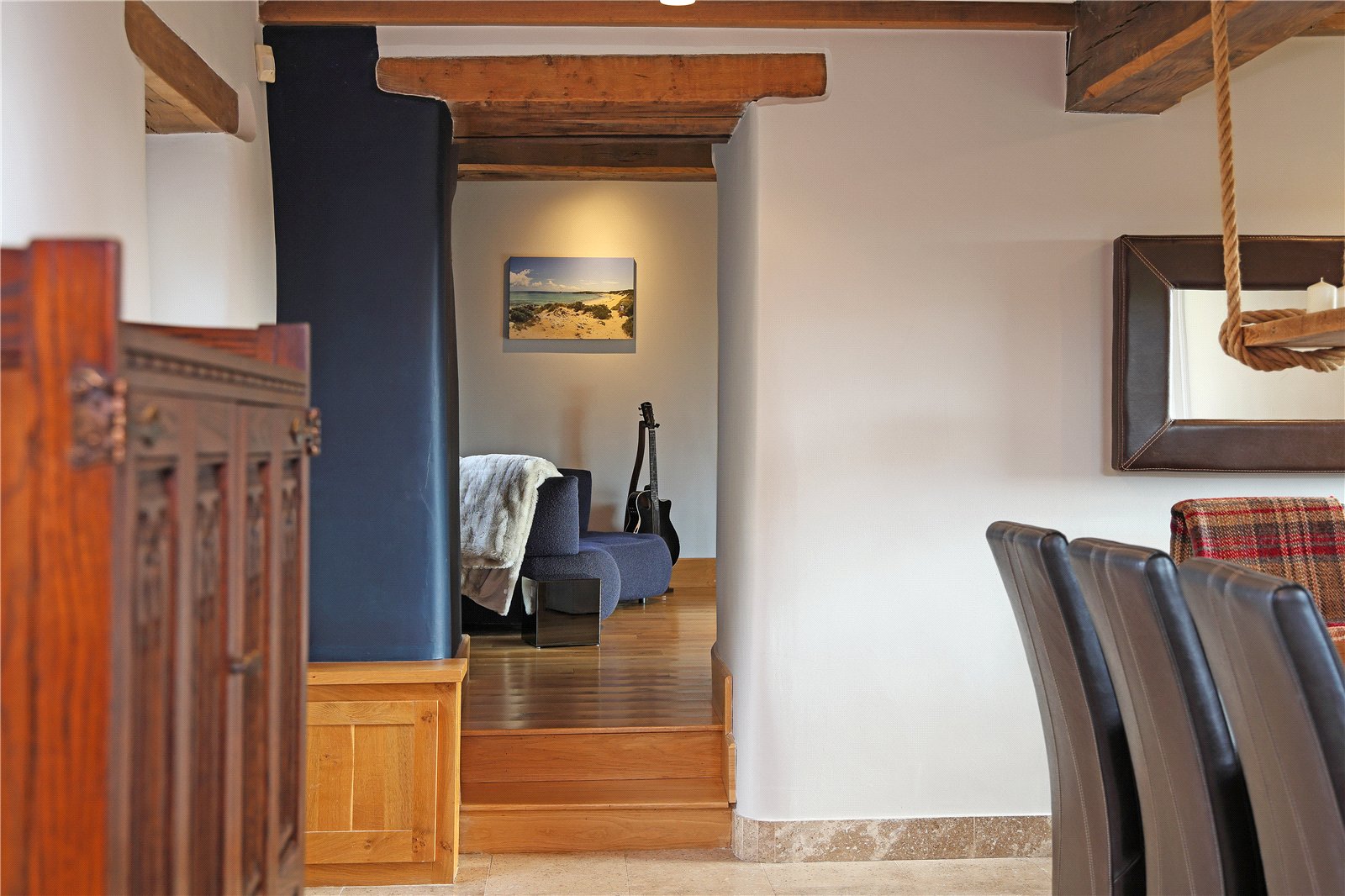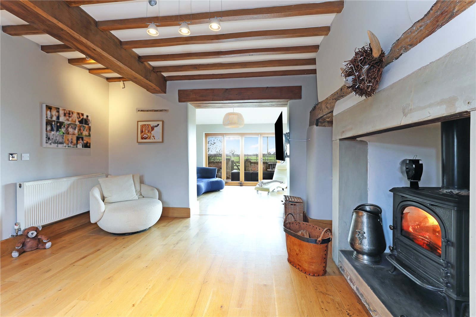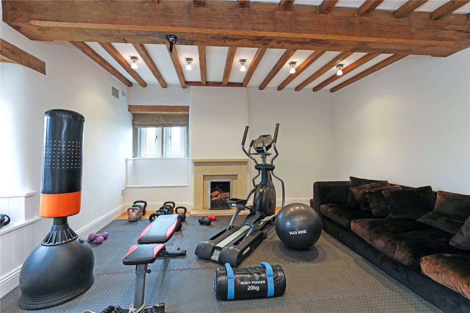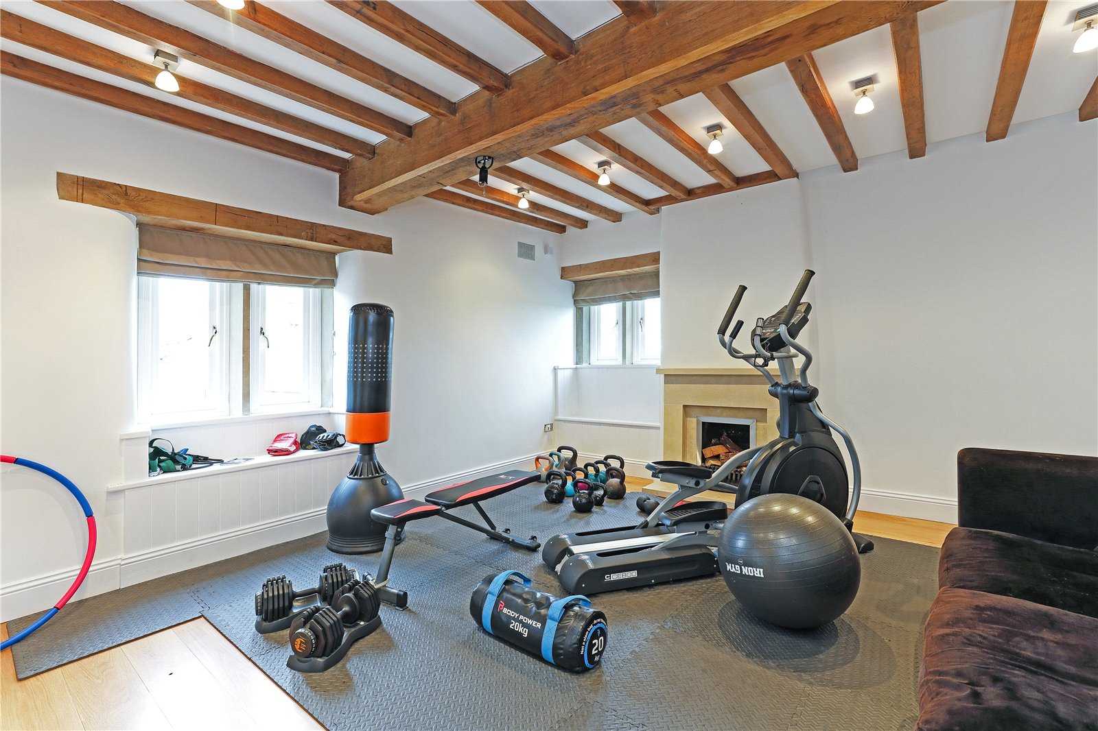 Living Room 16'9" x 15'3" (5.1m x 4.65m). A light and airy room with exposed beam work, natural oak flooring, dual aspect windows, fireplace, (currently used as a gym).