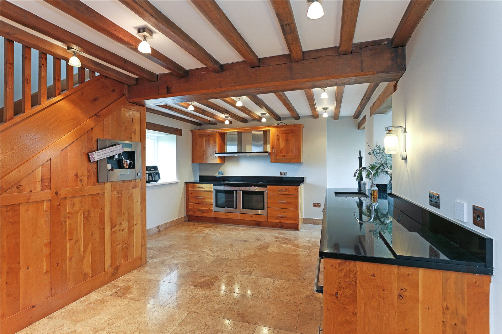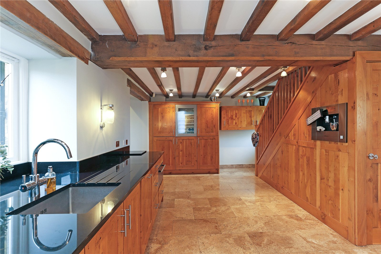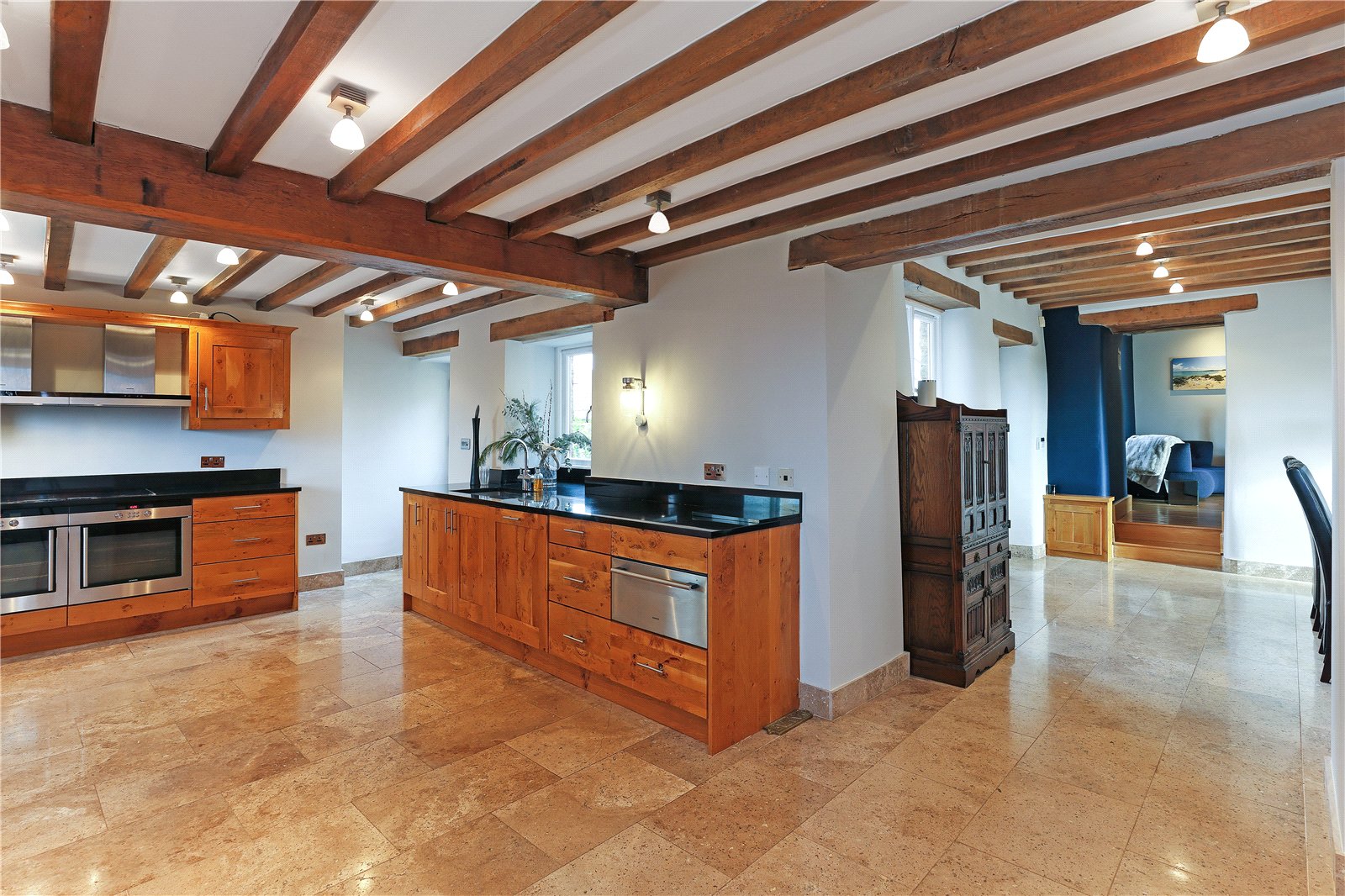 Breakfast Kitchen 21'9" x 12'1" (6.63m x 3.68m). Having underfloor heating, exposed beam ceiling, superbly appointed in a farmhouse style with granite worktops, undermounted sink with mixer tap unit, coffee machine, plate warmer and wine cooler, integrated appliances, dual aspect windows.