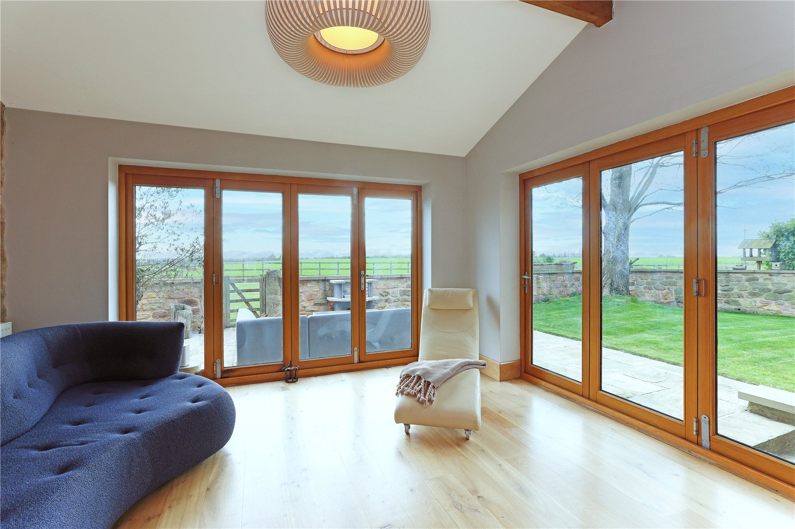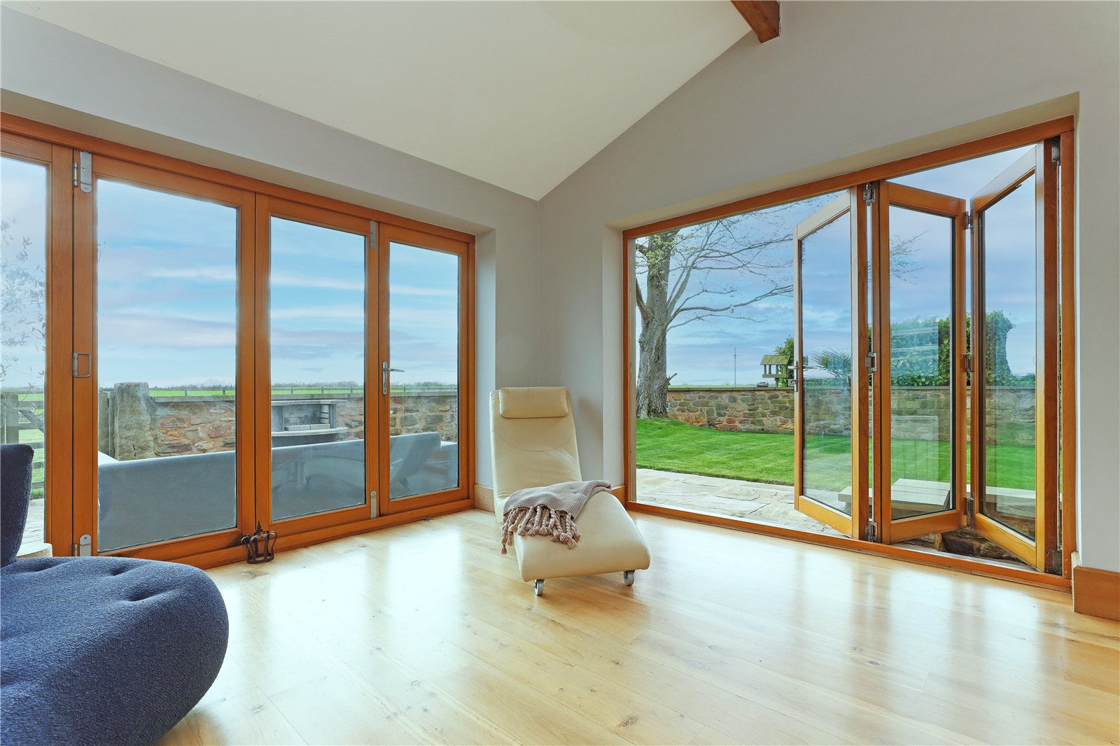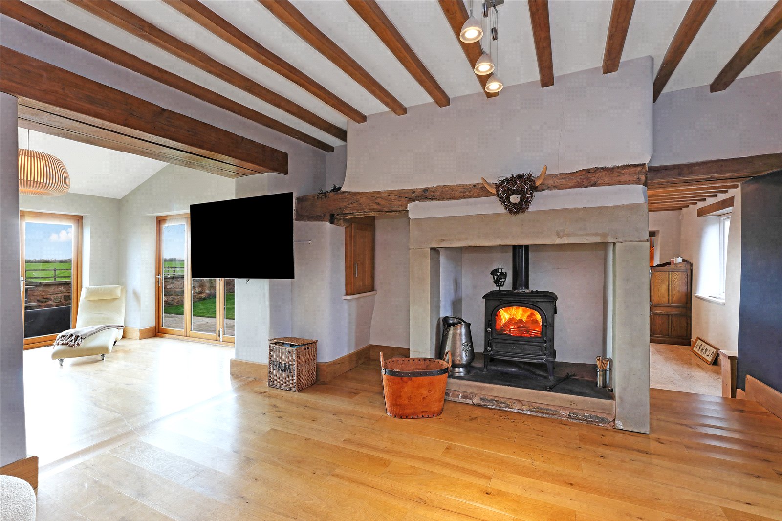 Garden Room 13'3" x 11'8" (4.04m x 3.56m). A light and airy room with two sets of French doors opening onto the patio and making the most of the extensive views with oak flooring, vaulted ceiling, exposed beamwork and stone wall.