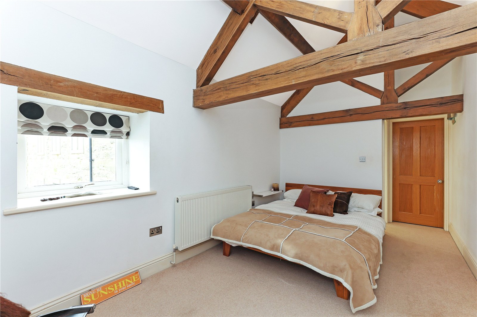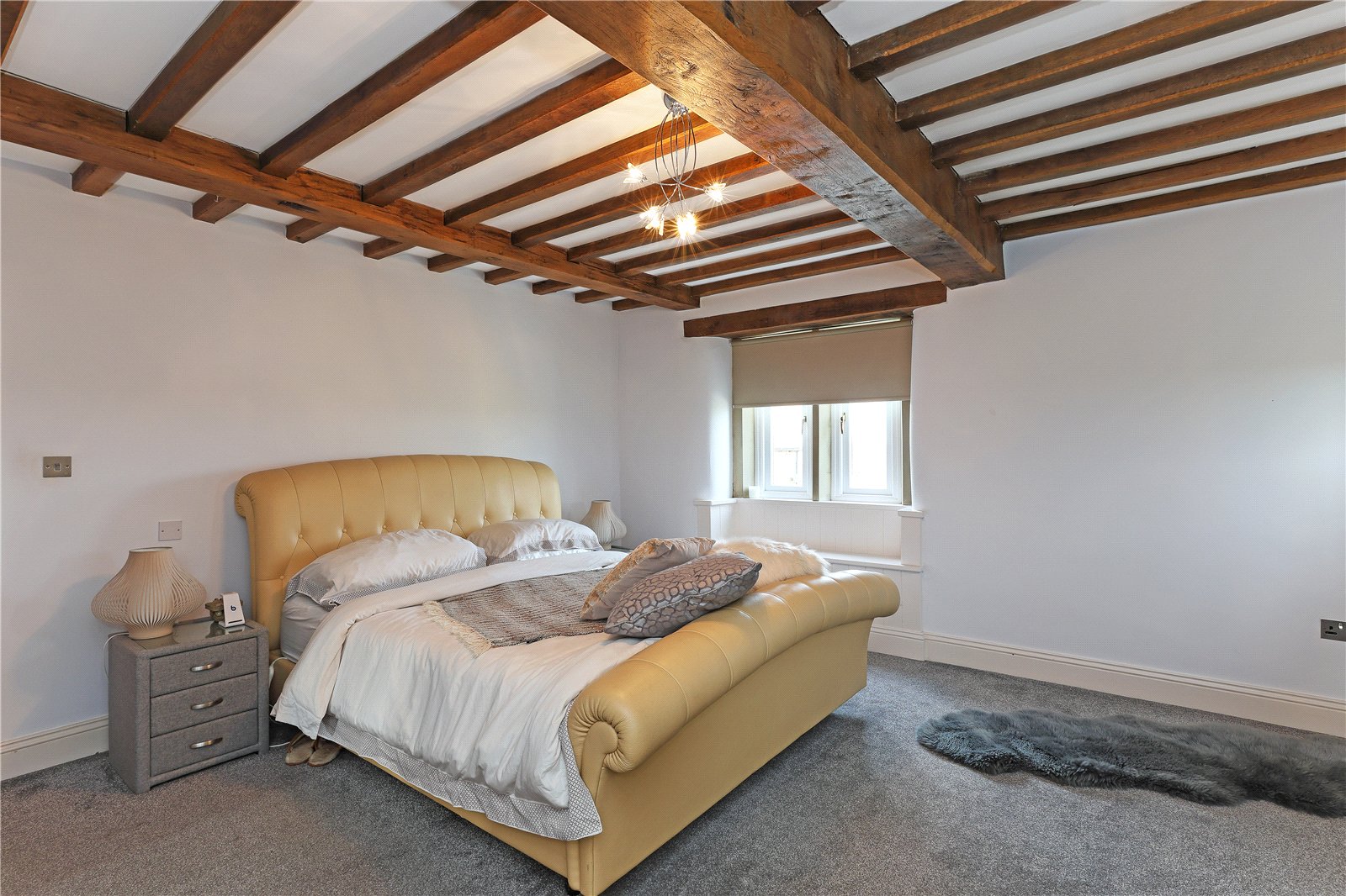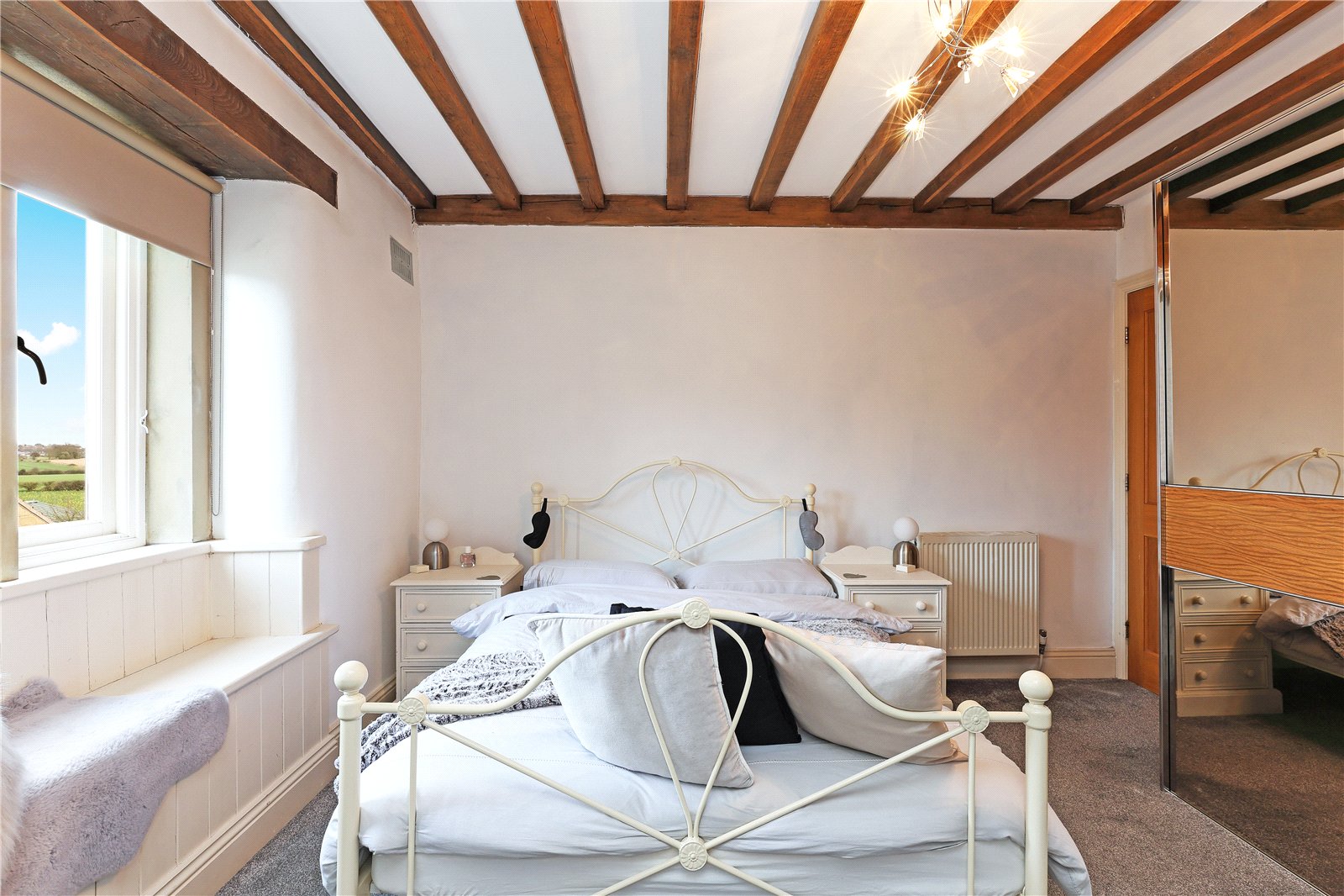 Bedroom 13' x 15'4" (3.96m x 4.67m). With exposed beam work, feature window with open views.