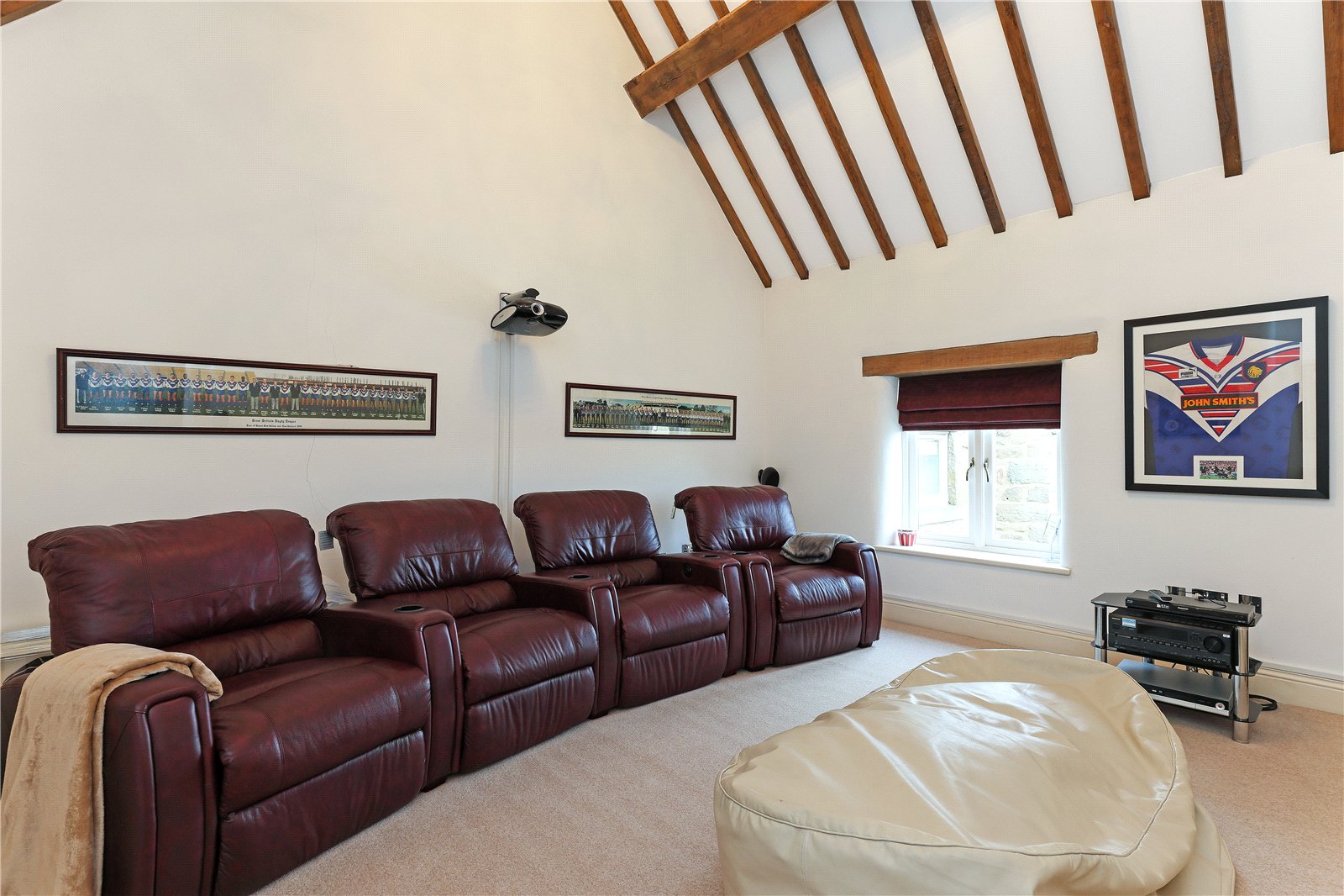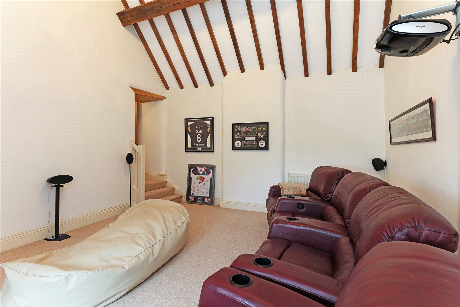 Bedroom/Home Cinema 16'1" x 13'11" (4.9m x 4.24m). With feature vaulted ceiling, exposed beam work, offering excellent space for those wishing to have as a bedroom or entertaining room.
