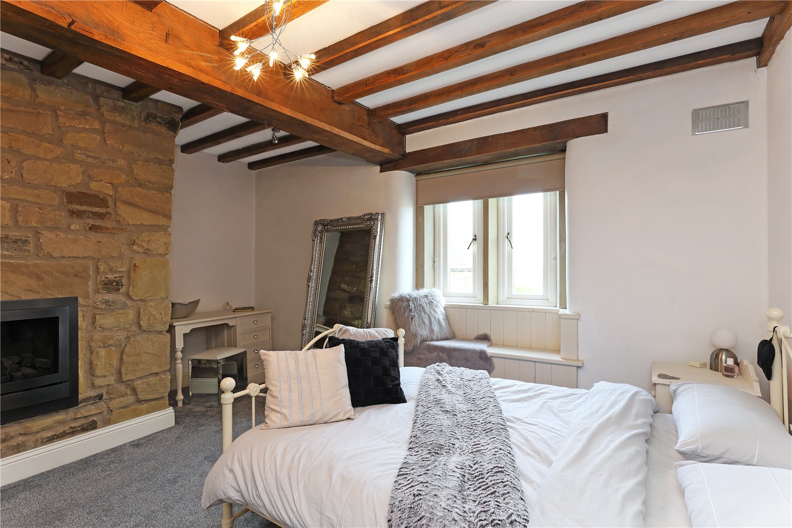 Master Bedroom 15'6" x 15'3" (4.72m x 4.65m). With beamed ceiling, feature exposed stonework with open flame fire, dual aspect windows making the most of the views, feature window seat.
