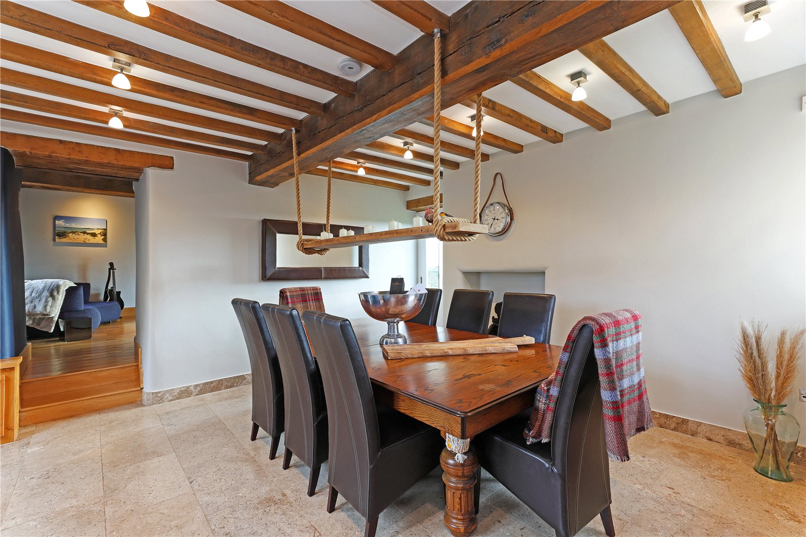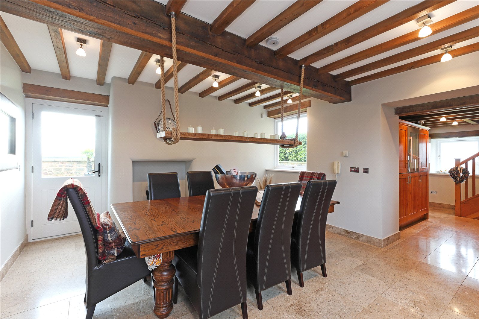 Formal Dining Room 14'4" x 16' (4.37m x 4.88m). Superb entertaining space with tiled floor, exposed beamwork, dual aspect windows makes this a light and airy feel and gives open access onto the kitchen.
