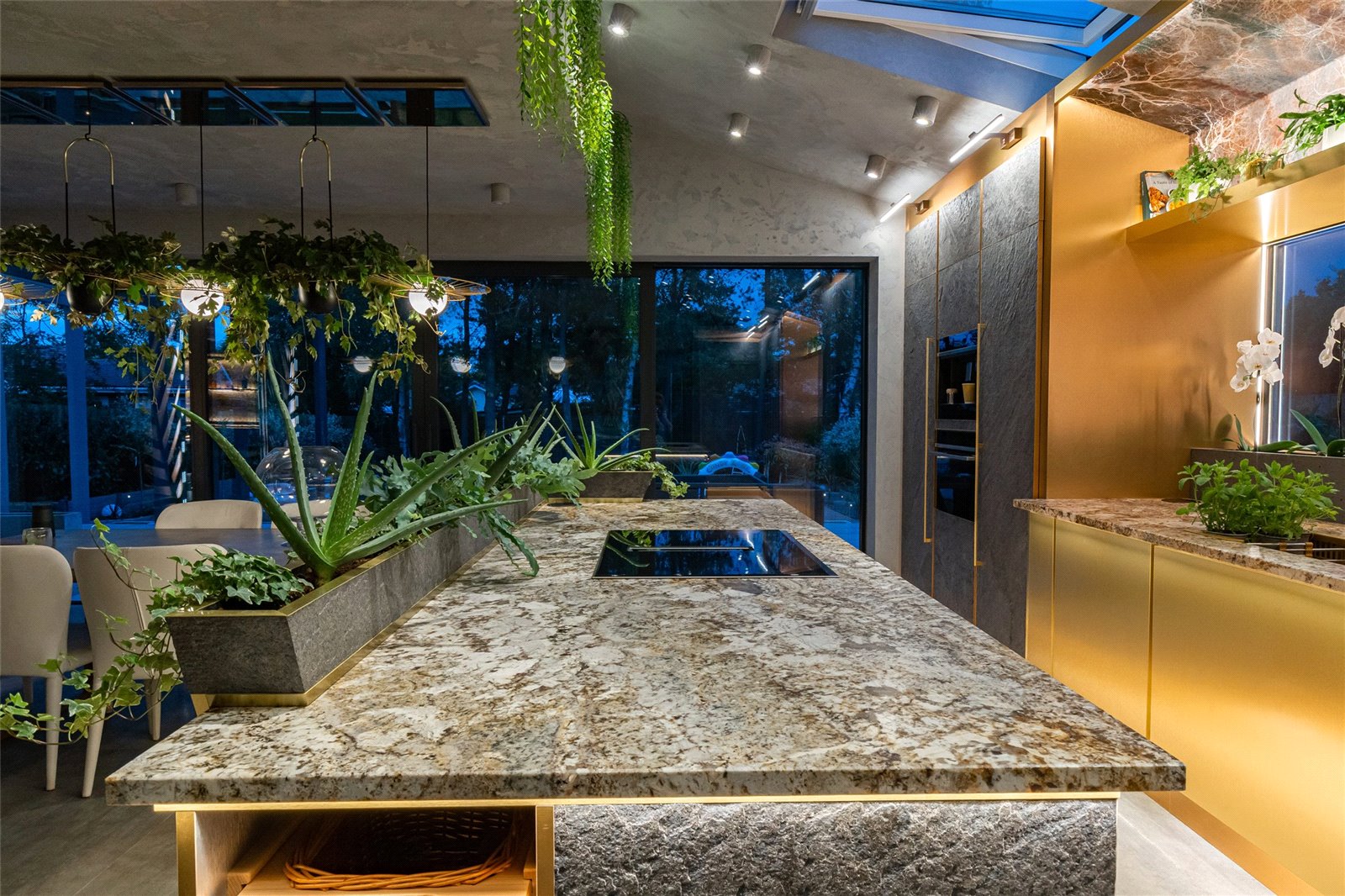 - Statement open-plan kitchen, family and dining area with natural stone finishes