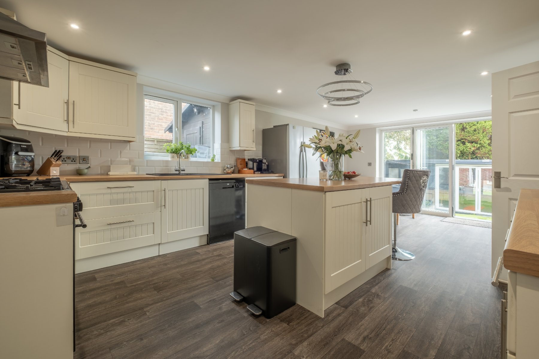The KITCHEN is stylish and practical, fitted with quality units, a range of white goods including a five-ring gas hob and cooker and a useful, sociable breakfast bar and island. There is also space for a breakfast table or, as the current owners have configured it, a relaxed seating area overlooking the rear garden via tri-folding doors that bring the outside in. The DINING ROOM sits alongside, providing a warm and elegant setting for family meals or gatherings.
