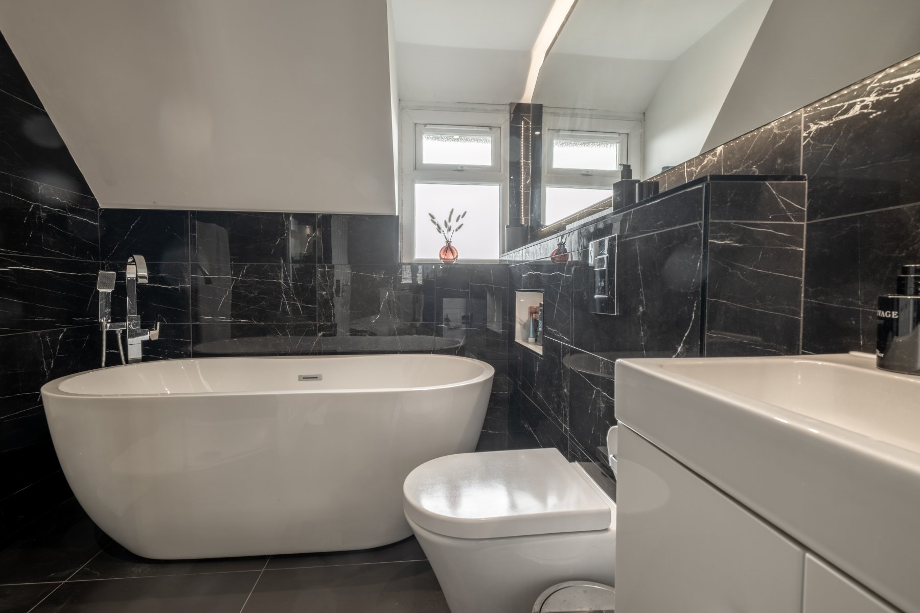 BEDROOM TWO is a generous double room, well-proportioned and finished in soft, neutral tones and includes a well-appointed EN SUITE with a shower cubicle, W.C., and wash hand basin. BEDROOM THREE is another double room with a rear aspect, currently utilised as a home office. The FAMILY BATHROOM is partially tiled and contemporary in style, finished to the same high standard as the rest of the home. It features a large, deep freestanding bath with an overhead shower, W.C., and wash hand basin.