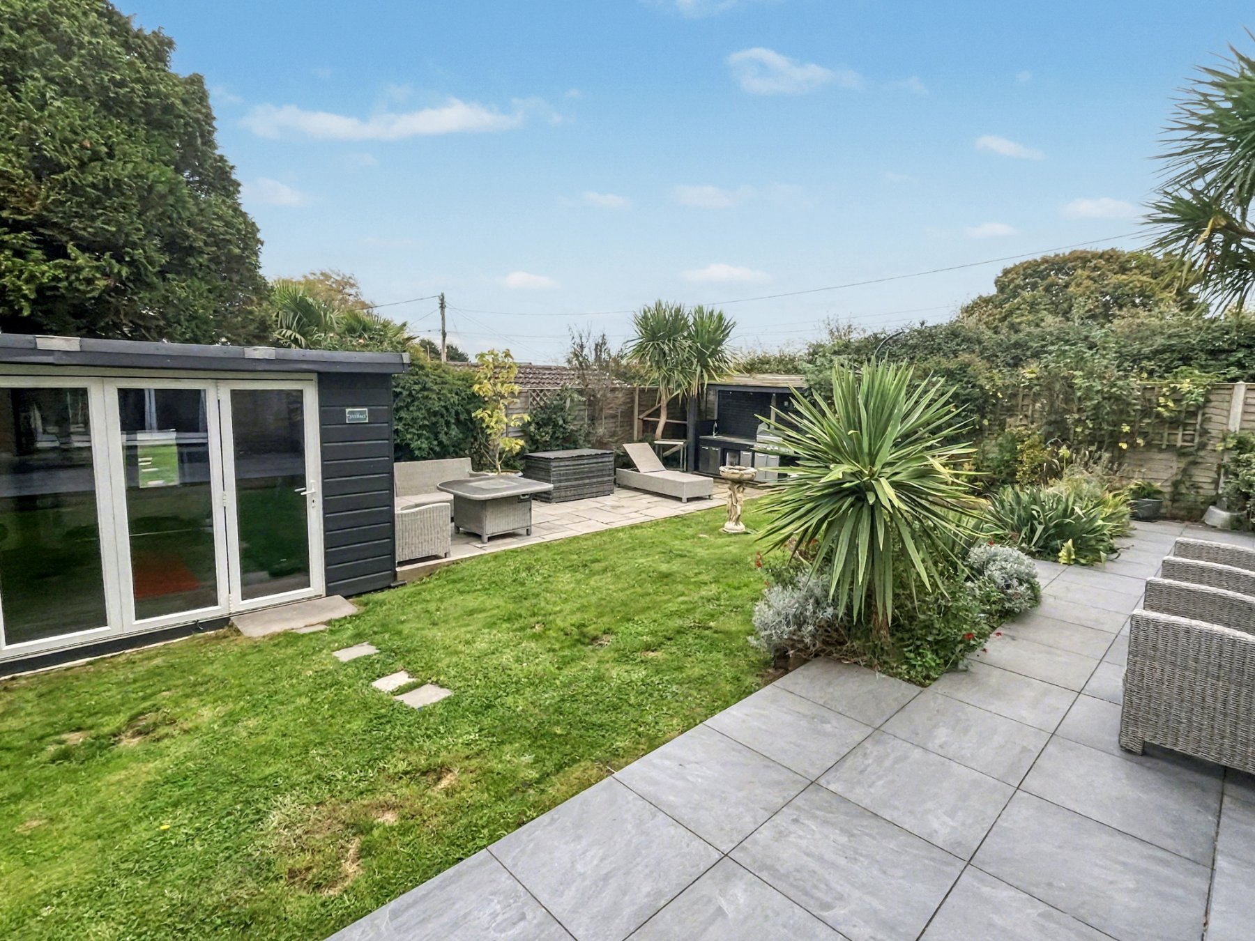 Outside, the property continues to impress. A generous driveway provides ample parking and access to a single GARAGE. Beyond this lies a substantial STUDIO/OUTBUILDING, currently used as a gym, offering excellent flexibility for hobbies, home working, or creative use. There is also a hot tub, ideal for enjoying the seclusion and relaxation of your surroundings. The gardens are private, neatly landscaped, and arranged to provide pleasant areas for seating and relaxation.