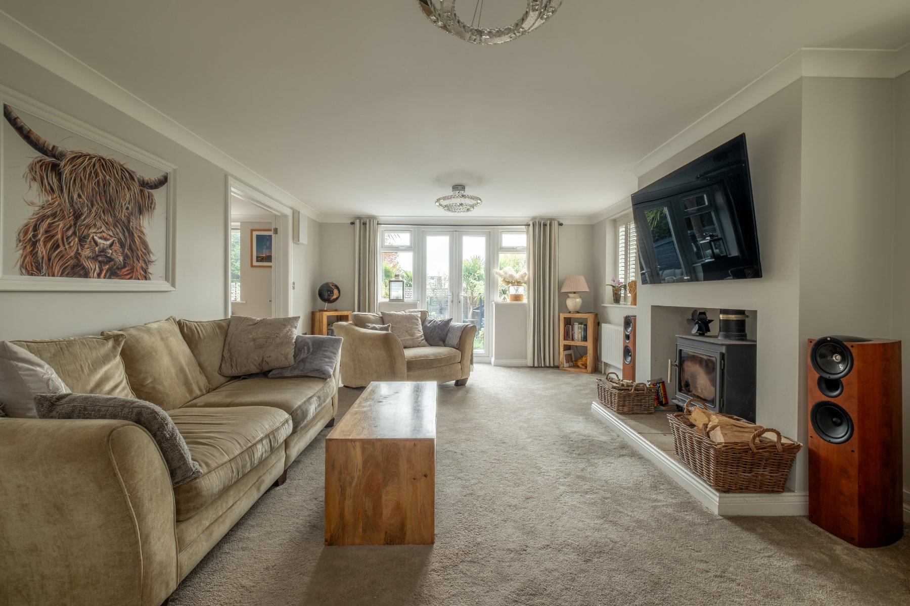 The SITTING ROOM enjoys a wonderful sense of light, with wide glazed doors opening to the garden and an integrated wood burner forming a natural focal point. It is an inviting and well-proportioned space, ideal for both relaxation and entertaining.