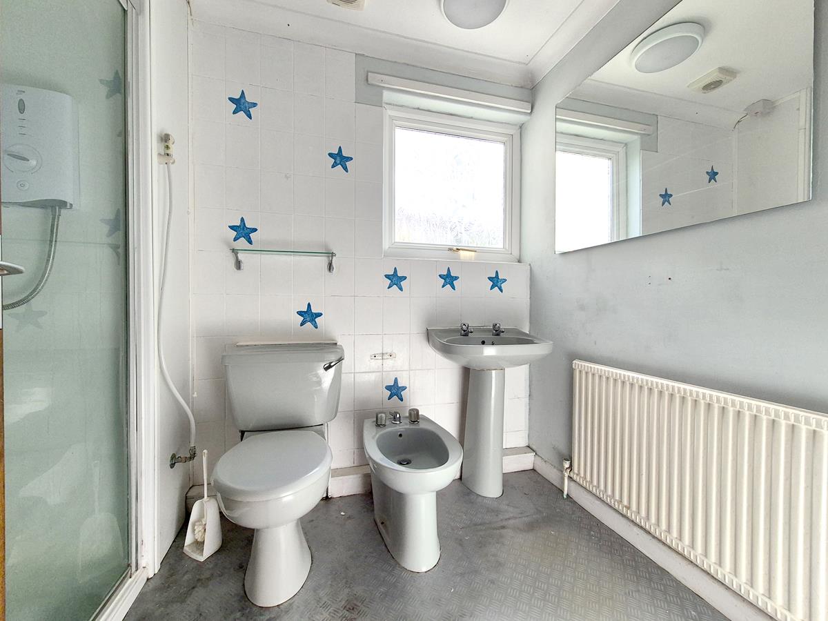 Shower Room - Comprising of a large shower cubicle, close couple W.C., bidet, pedestal wash hand basin and frosted window to the side. Part tiled walls and a frosted window to the side.