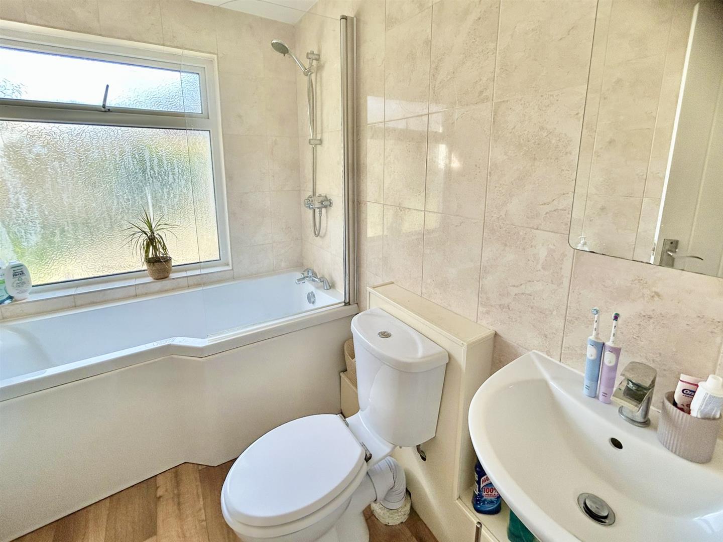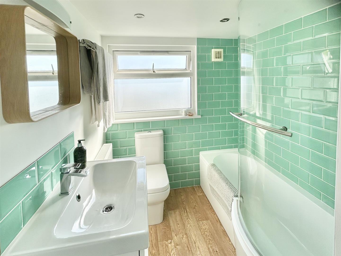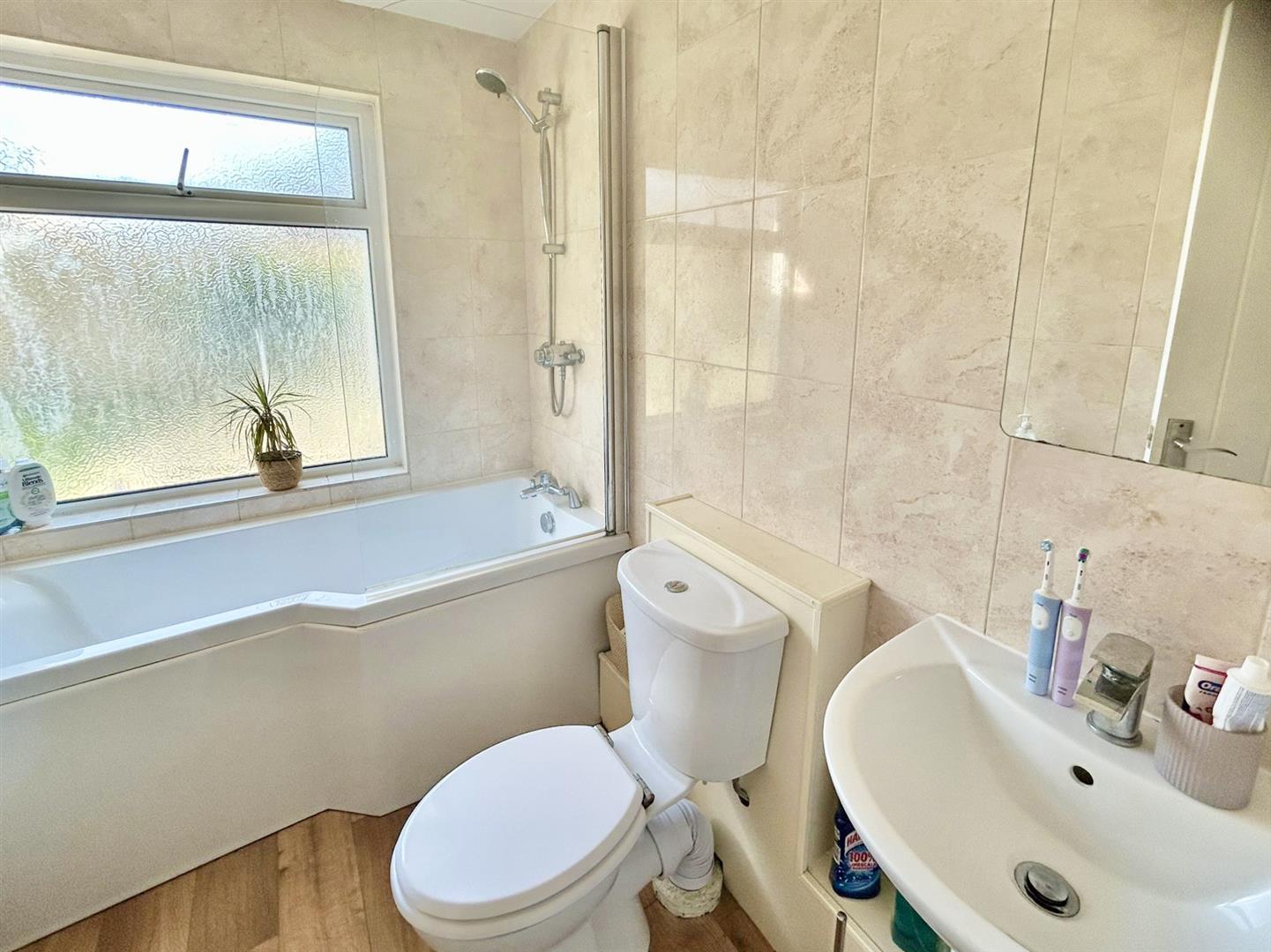 Bathroom - Comprising a P shaped bath with mixer tap and shower over, close coupled w.c. and a pedestal wash handbasin with mixer tap over. The room has tiled walls and an obscured window to the side.