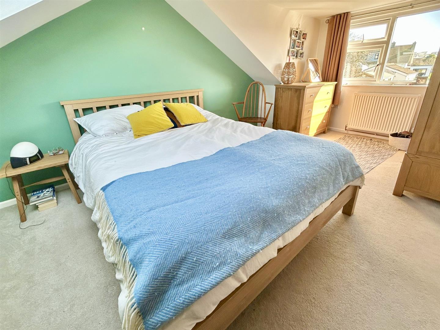 Bedroom One - 5.03m narrowing to 2.82m x 4.04m (16'6" narrowing - With outlook to the front, over the village and towards the sea in the distance. The room has a skylight and built in wardrobes.