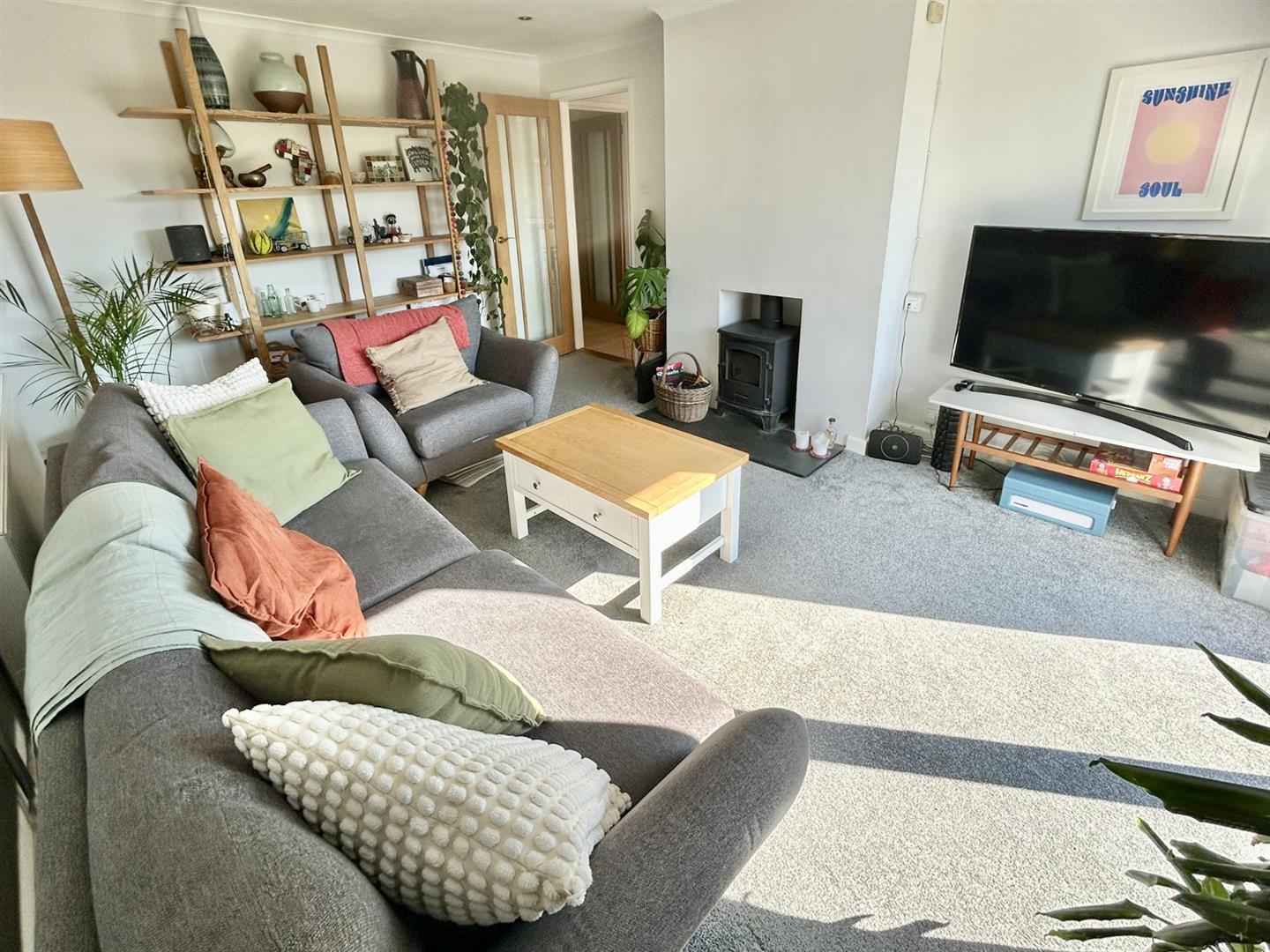 Living Room - 4.80m x3.58m (15'9" x11'9") - A dual aspect room with patio door to the front decked area. There is a fireplace which houses a wood burner with stone hearth.