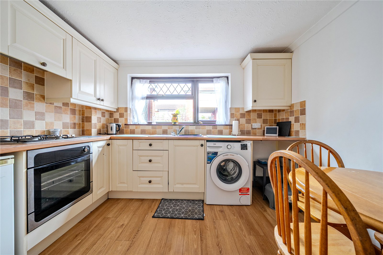 Continuing along the hallway, the kitchen is situated on the right-hand side and is fitted with a range of practical units together with a built-in cooker and hob. The layout offers space and plumbing for a washing machine, as well as space for a freestanding fridge, making it both functional and convenient for day-to-day use. The kitchen provides a practical working environment with ample room for food preparation and storage.