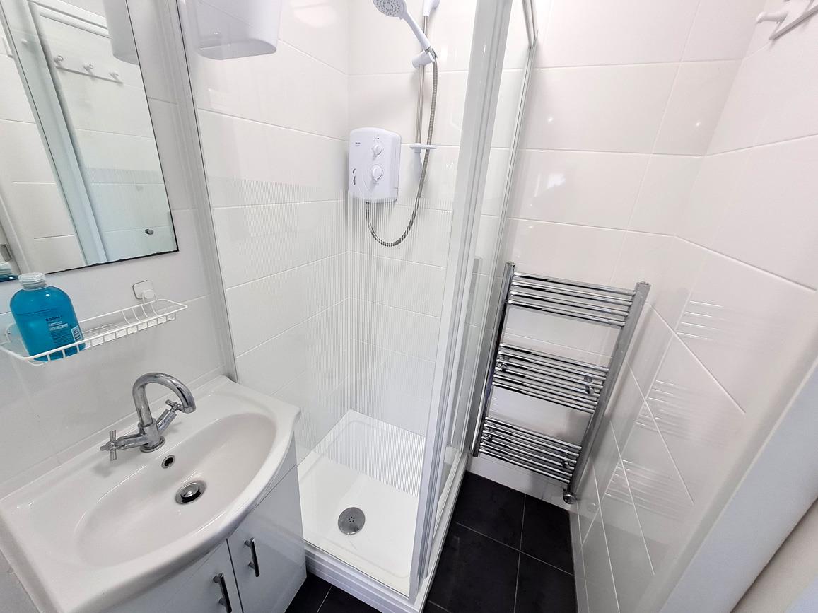 Shower Room - Having a white tiled shower enclosure with an electric shower, a pedestal wash hand basin with a mixer tap over and storage cupboard under, a chrome heated towel rail, an extractor fan and tiling to the walls and floor. Sliding door to