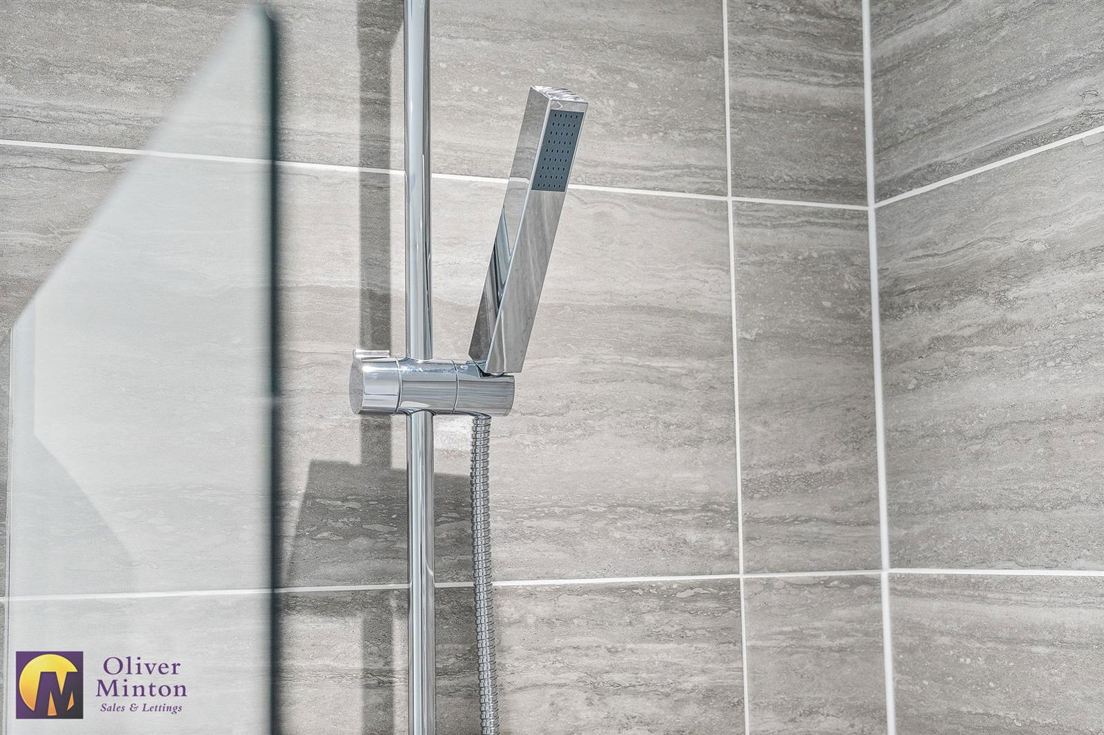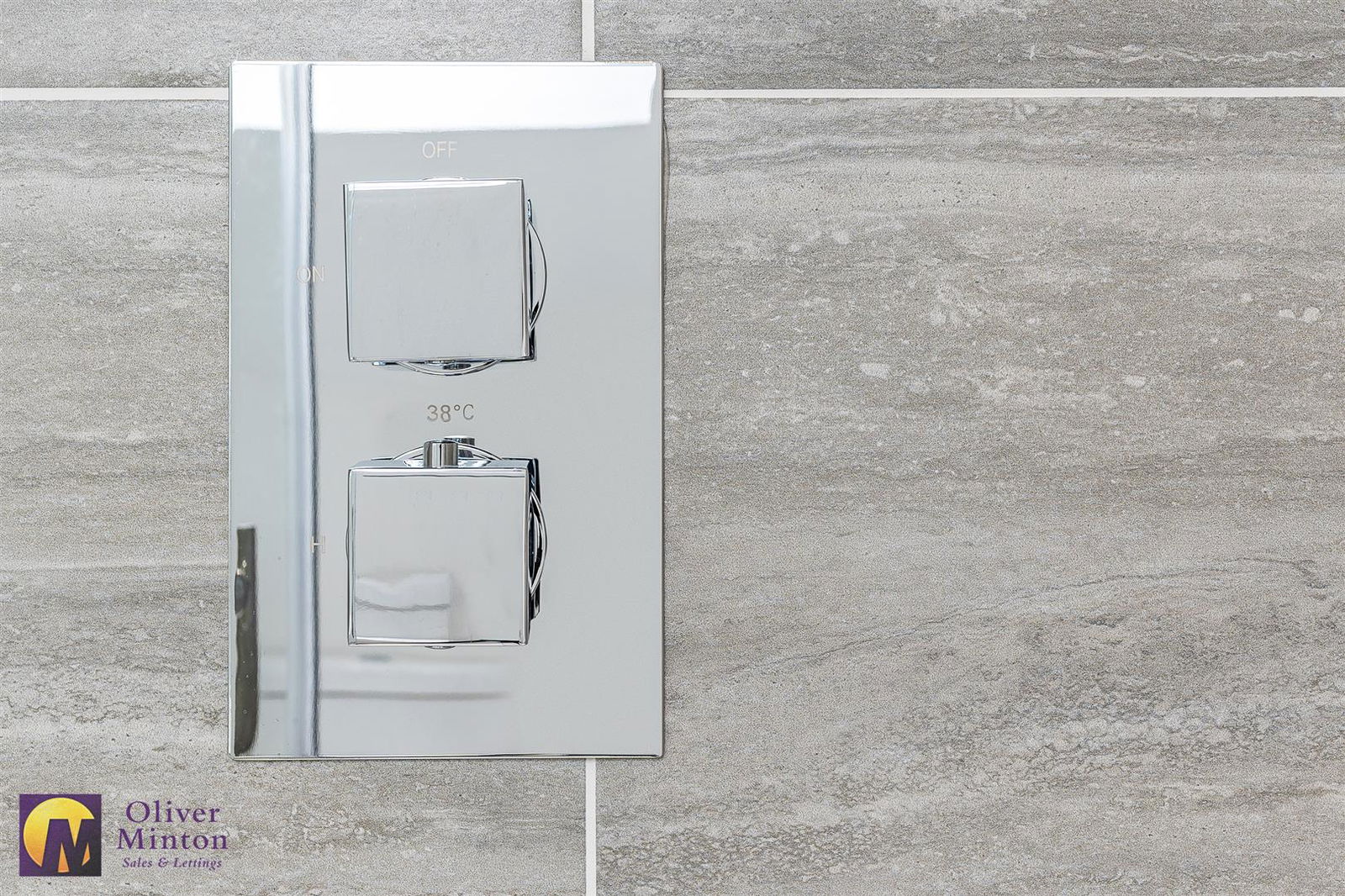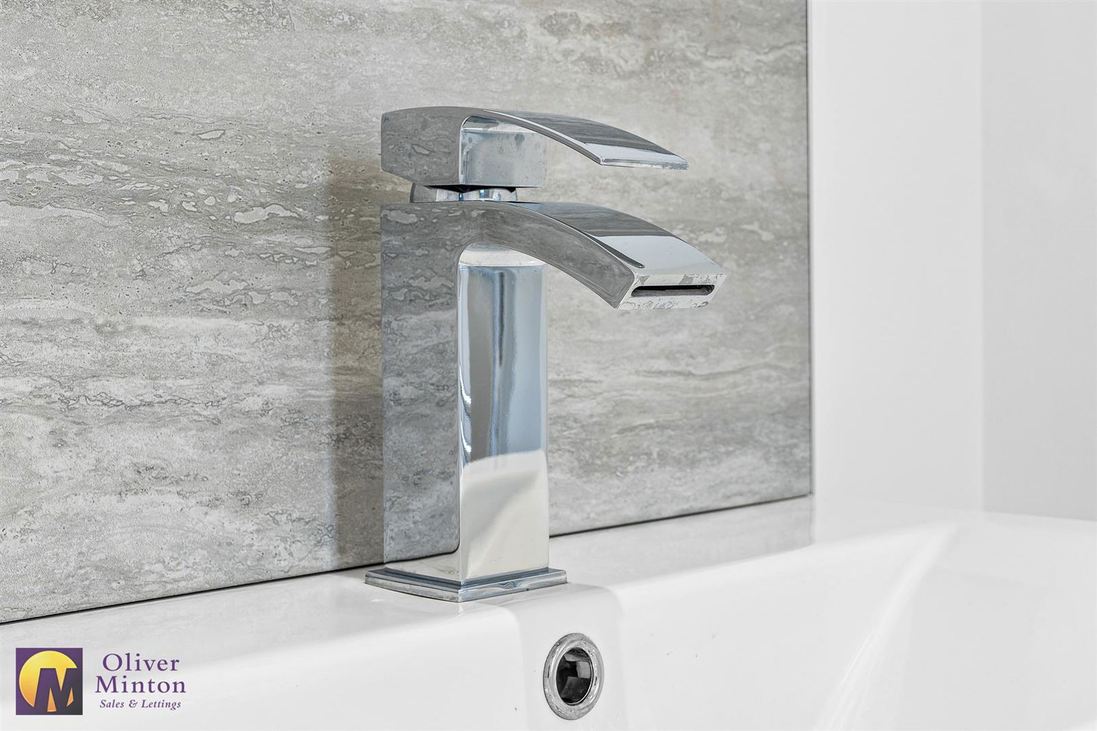Luxury white suite comprising WC, wash hand basin with cupboard under, chrome heated towel rail, obscure uPVC double glazed window, laminate wood flooring, inset ceiling lights. Extractor fan.